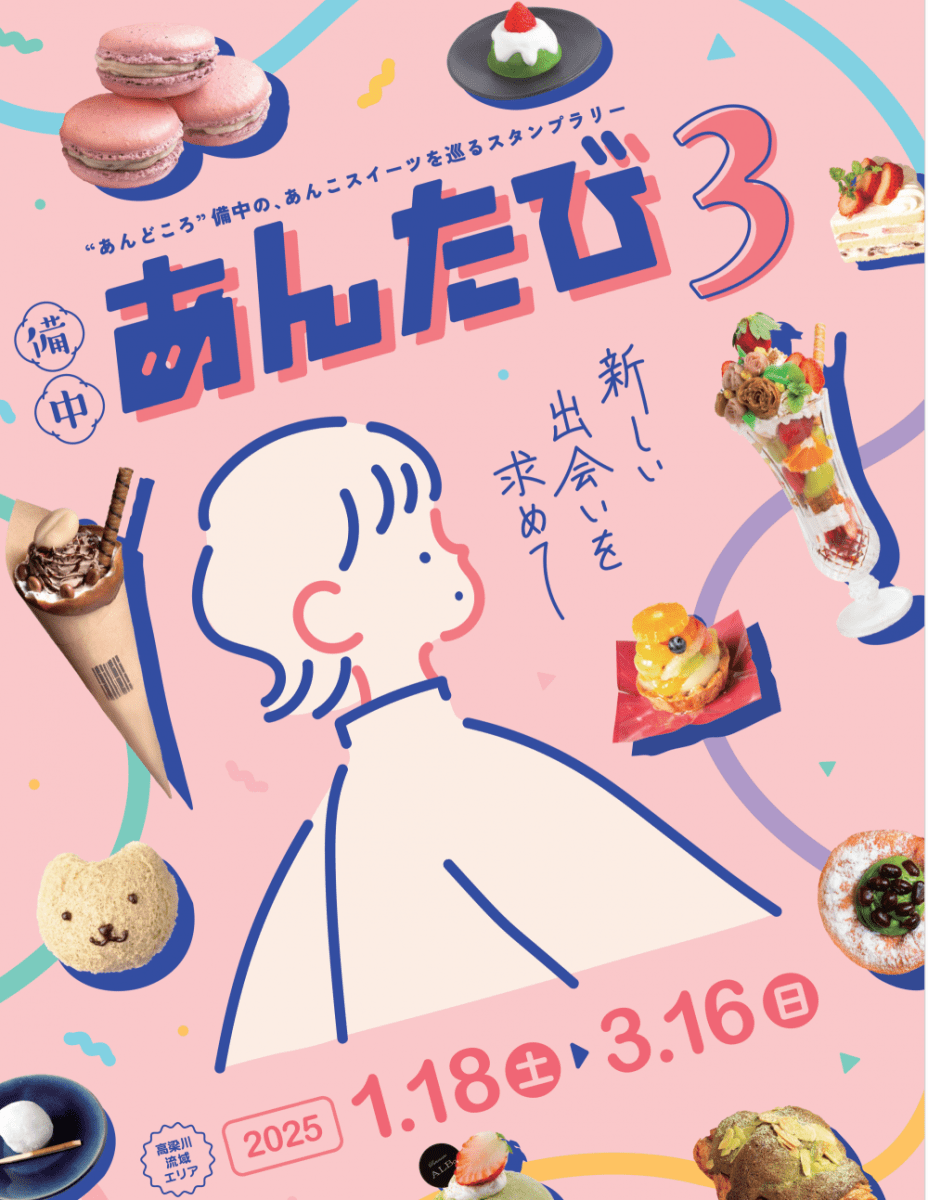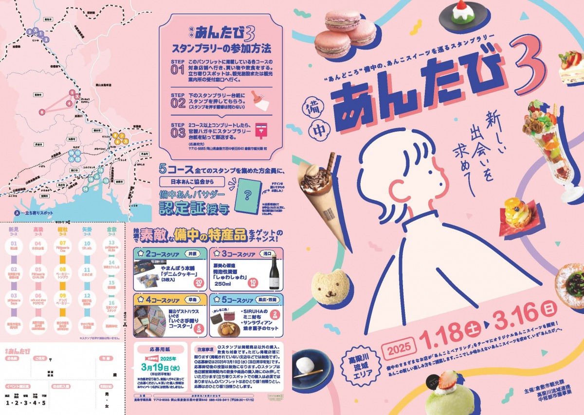 高梁川流域エリアの5市町(倉敷市、新見市、高梁市、総社市、矢掛町)であんこスイーツを巡るスタンプラリーを実施。