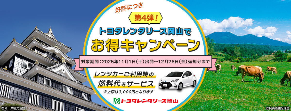 対象期間中に岡山空港着のANA便を往復利用し、トヨタレンタカー岡山空港店でレンタカーを利用の方を対象に、レンタカー利用時の燃料代が上限3,000円(税込)まで負担されるキャンペーンが実施されます。