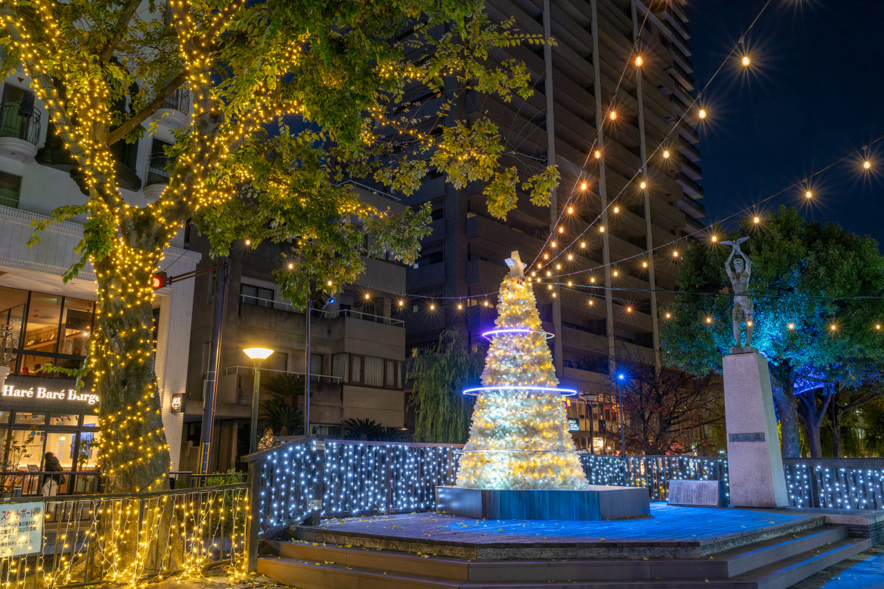 街なかのオアシス「西川緑道公園」がグラデーションに輝くイルミネーションに彩られます。夜空の星々のようにきらめく水辺のイルミネーショや大きな光のアーチ(12月からの登場予定)、高さ4mのホワイトツリーなど、様々なイルミネーションが登場します。