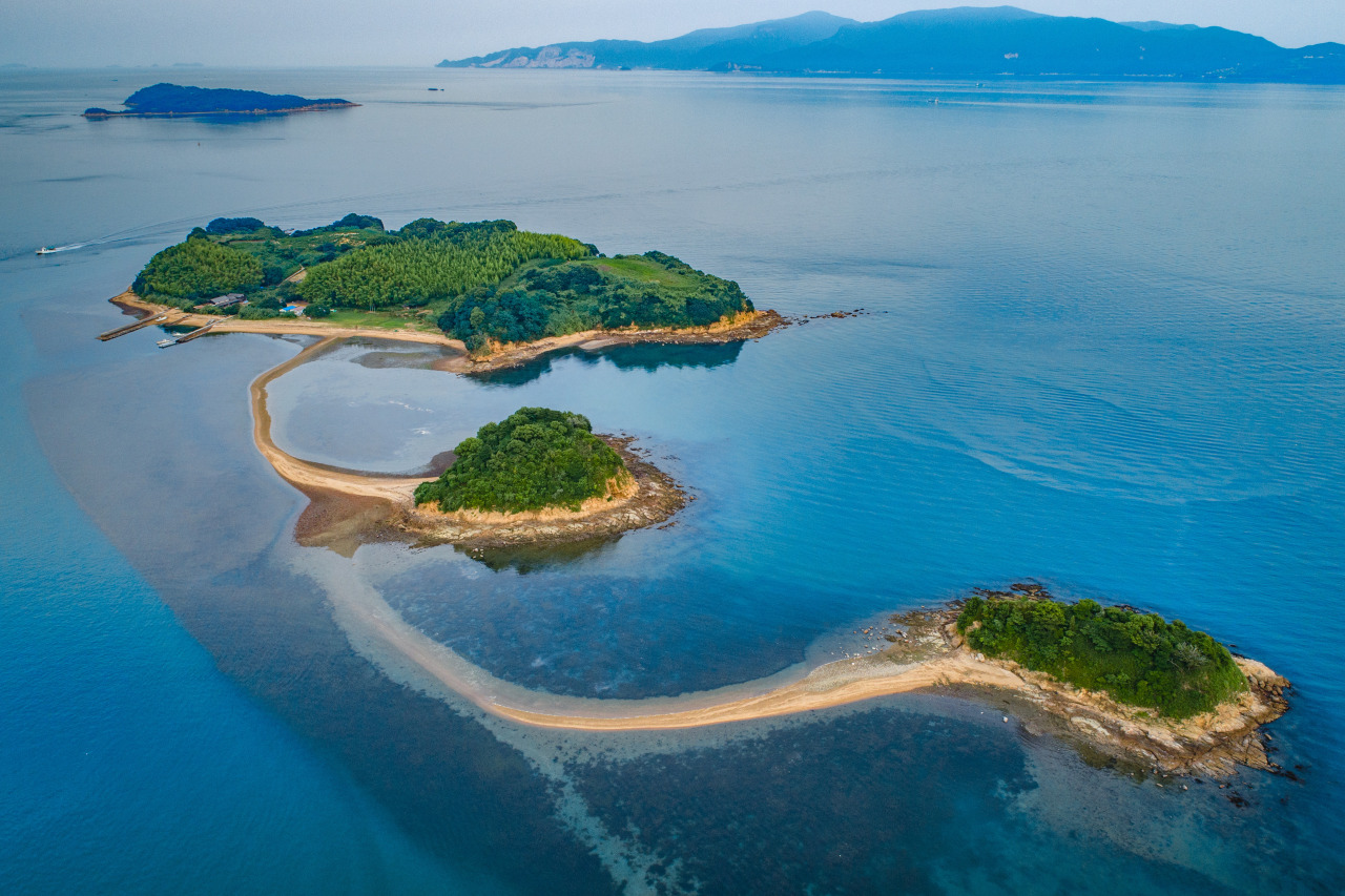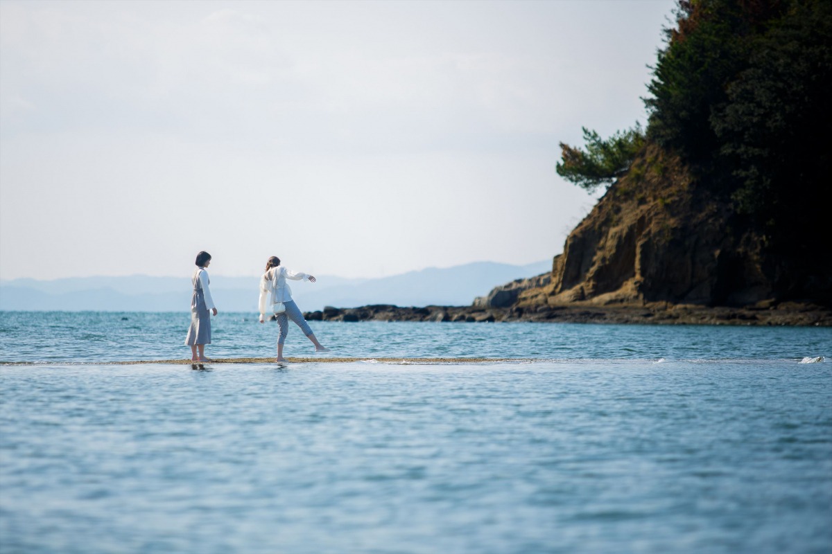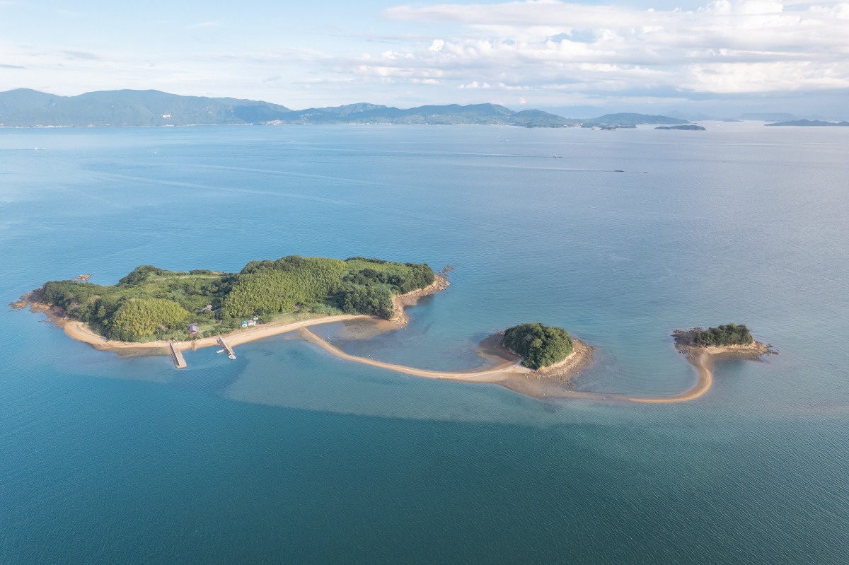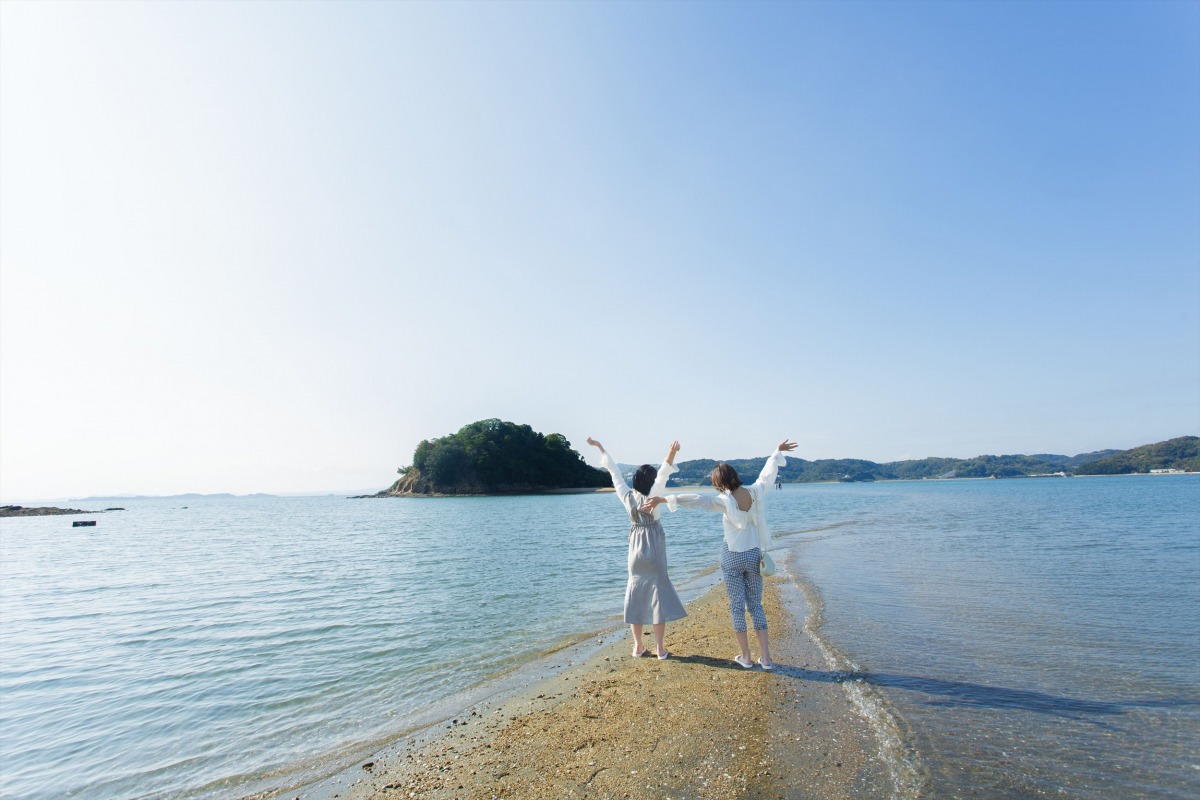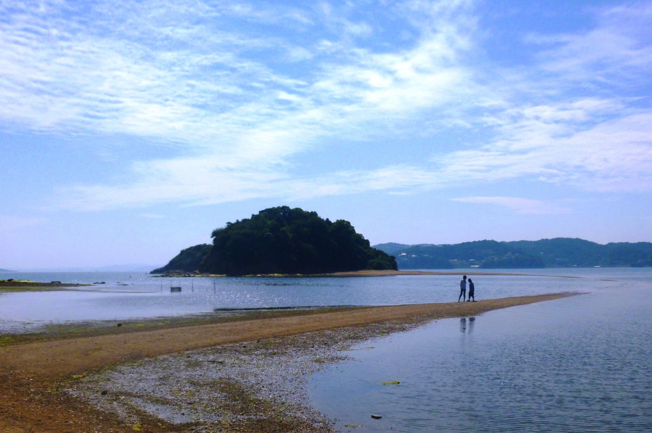 瀬戸内市牛窓沖に浮かぶ黒島では、潮がよく引く干潮時にロマンチックな砂の道が現れます。