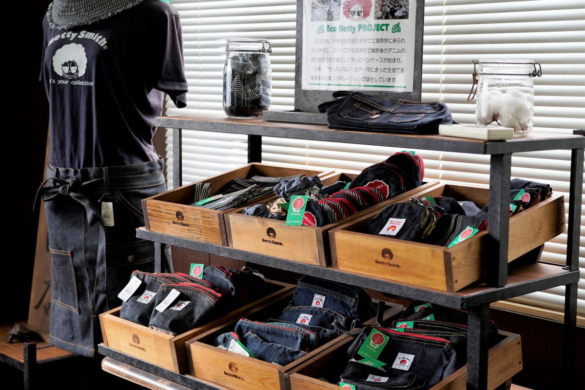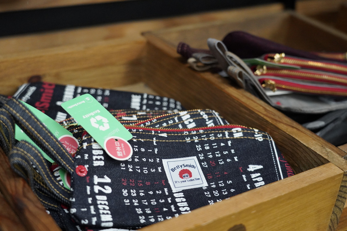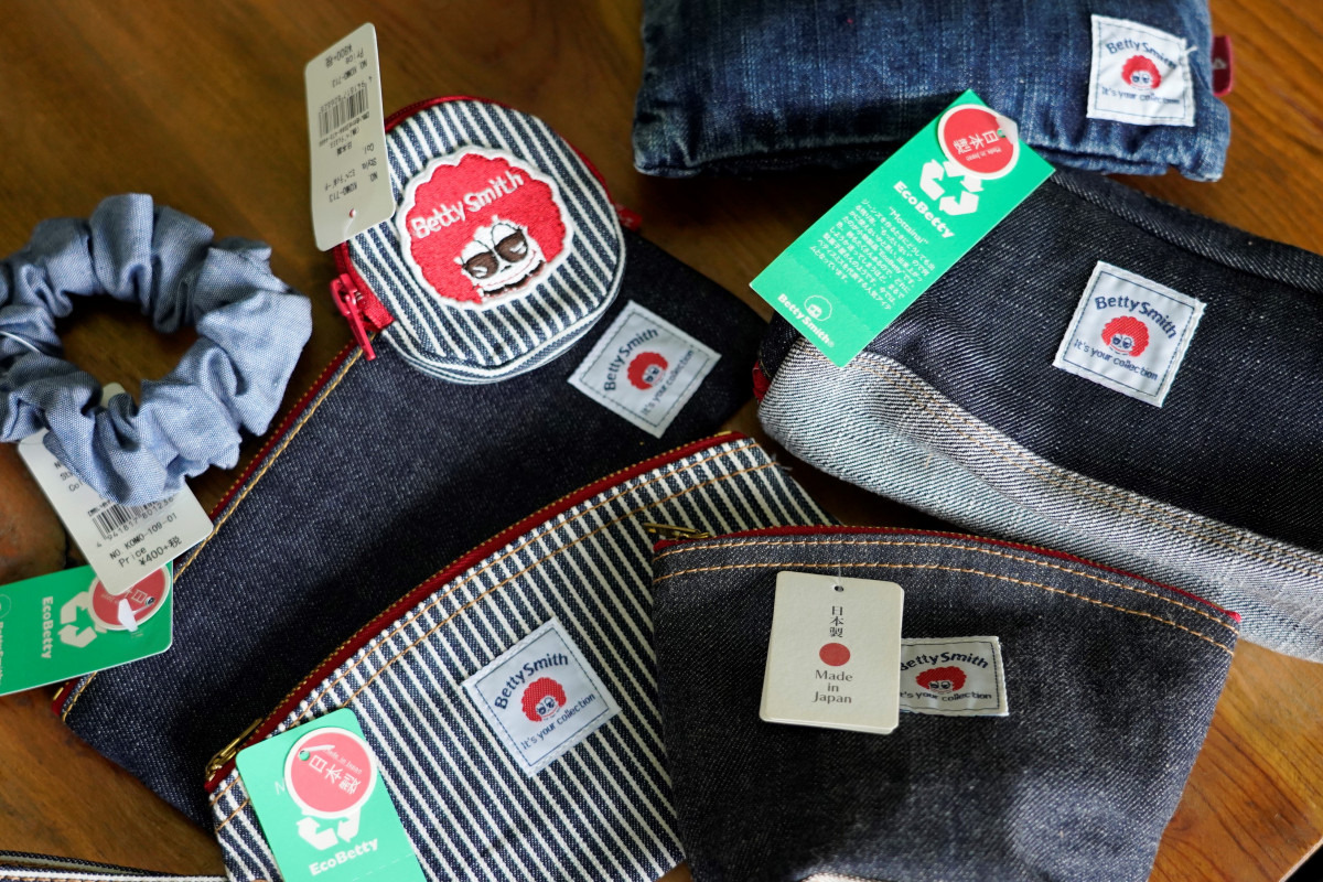 2002年、新しい動きがありました。岡山県の地場産業としてベティスミスの縫製工場が教科書に掲載されたことをきっかけに、小学生の工場見学を受け入れることに。「その時、工場に訪れた生徒さんから見学の記念になるようなものがあればとリクエストされて、ジーンズの端切れを使ったペンケースを作成したんです。これが大好評でした」。そのペンケースを工場に置いていたところ、観光で訪れた一般の人から「これは売り物ではないんですか」と聞かれることが増え、2003年にデニム雑貨のサスティナブルブランド<EcoBetty>が誕生。商品ラインナップは現在20~30種類を数え、駅や高速道路のサービスエリア、空港などでも販売されています。「残布を有効利用することでゴミが減り、買う人にも喜ばれる。今思えばSDGsの走りだったように思います」と大島さん。ここにもターニングポイントを見逃さない、大島さんの先見の明や判断力が活きています。
