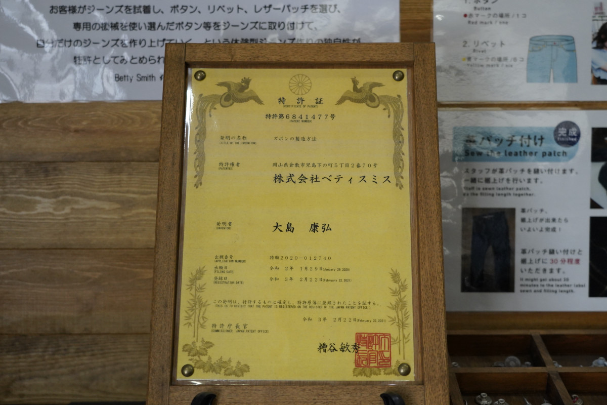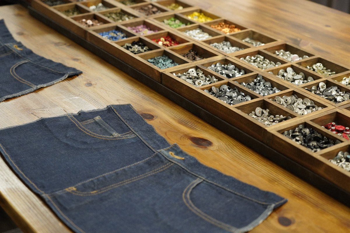 今や岡山・児島観光の目的のひとつにもなっているジーンズ作り体験。「時間やお金がかかるオーダージーンズより、もう少し気軽にジーンズ作りができるサービスがあればと思って、2010年から始めました」と大島さん。自分に合うサイズのジーンズに、好きなボタンやリベットなどを選んで自ら取り付け、1時間程で完成。当日持ち帰ることもできるジーンズ作りの体験は他にないアイデアで話題に。「実はトッピングなどを自由に選べるセルフうどんをヒントにしたんです」と大島さんは笑います。意外なところから着想を得た体験事業はその斬新さもあって口コミで注目を集め、さらなる観光客の増加に繋がりました。2021年2月には「ジーンズ作り体験」に関する特許も取得。倉敷・児島の観光客誘致の一翼を担っています。