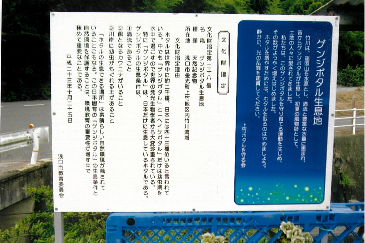 浅口市金光町上竹(かみだけ)地区は、遙照山を水源とする竹川の上流域にあって、古くからゲンジボタルが生息し、例年5月下旬から6月上旬の夜間に、ホタルの飛翔する幻想的な風景が見られます。「上竹ホタルを守る会」は平成15年(2003年)ホタルの保護を目的に、上竹地区の住民有志によって結成。ホタルの順調な生育と、ホタル観賞者の安全のため、定期的に竹川周辺の草刈りや清掃を行うほか、毎年地元の小学校でホタルの生態に関する出前授業を実施。次世代に美しい自然環境とホタルを継承するための取組を行っています。上竹地区は平成23年(2011年)「ゲンジボタル生息地」として浅口市の天然記念物に指定。ホタルの飛翔シーズンには県内外から多くの人が訪れ、岡山県の観光スポットになっています。