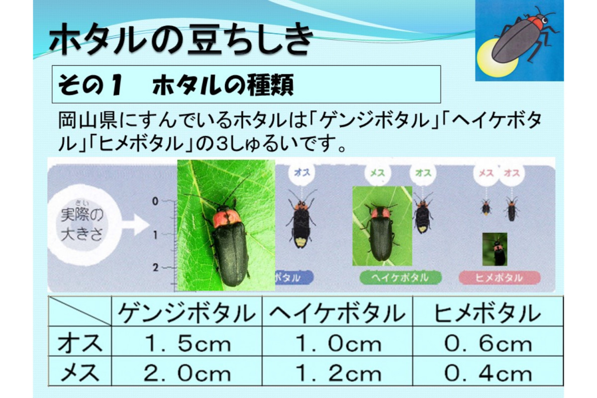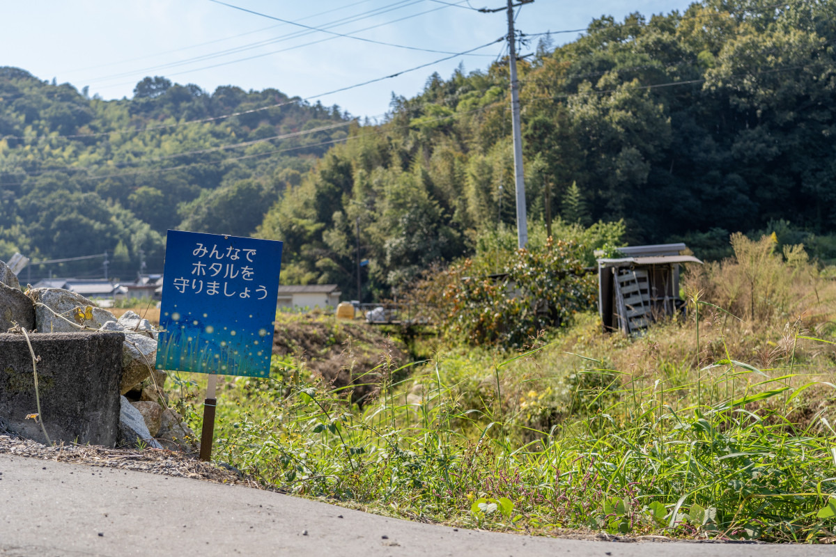 同会では、ホタルの保護を目的とした清掃活動に加え、地元の子どもたちにホタルの生態と自然環境保護の大切さを伝えるため、浅口市立金光竹小学校での出前授業を毎年実施。授業を通じてホタルのすむ環境を次世代に継承することを目指しています。瀬良さんは「子どもたちはすごく興味を持って聞いてくれます。これをきっかけに郷土の自然や文化を意識してもらえたら」と語ってくれました。さらに、平成24年(2012年)、同会の取組が浅口市の市民提案型協働事業「あさくち未来デッサン」(現:あさくち協働のまちづくり事業)に採択されたことに伴い、ホタルを強い光から守るための防犯灯の照明カバーと、ホタル保護を呼びかける看板を地区に設置。この時設置した看板には、竹小学校の子どもたちが描いたイラストが使われています。