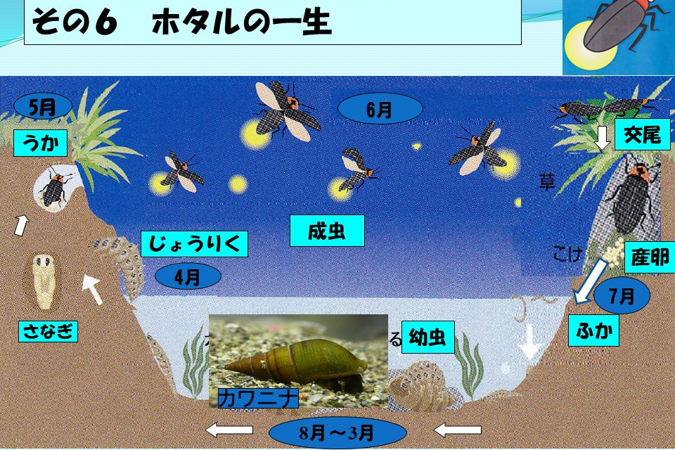 世界中に約2000種、日本には約40種存在するといわれるホタル。なかでも、ゲンジボタルは日本にだけ生息しており、幼虫期を水の中で過ごす点が珍しく、世界の生物学者から珍重されています。その一生は約1年間で、淡い光を放ちながら美しい乱舞が見られるのは、最後の10日~約2週間の短い期間のみ。なお、ホタルが飛び交うのは求愛活動であり、交尾から数日後に産卵。約一ヵ月後に孵化し、8月頃~3月頃にかけて、川の中で数回脱皮しながら大きくなります。そして4月頃の雨の降る夜に川から上陸。湿った柔らかい土の中に潜って約50日後にサナギになり、その後成虫となって飛び立ちます。「ホタルはきれいな川でないと生きられない」と言われる通り、ゲンジボタルには厳しい生息条件があり、それは①清流があること、②餌となるカワニナ(淡水性の巻貝の一種)がいること、③川岸に幼虫が潜ることができる土があることの3つ。上竹地区はその条件がそろう県内でも希少な土地といえそうです。