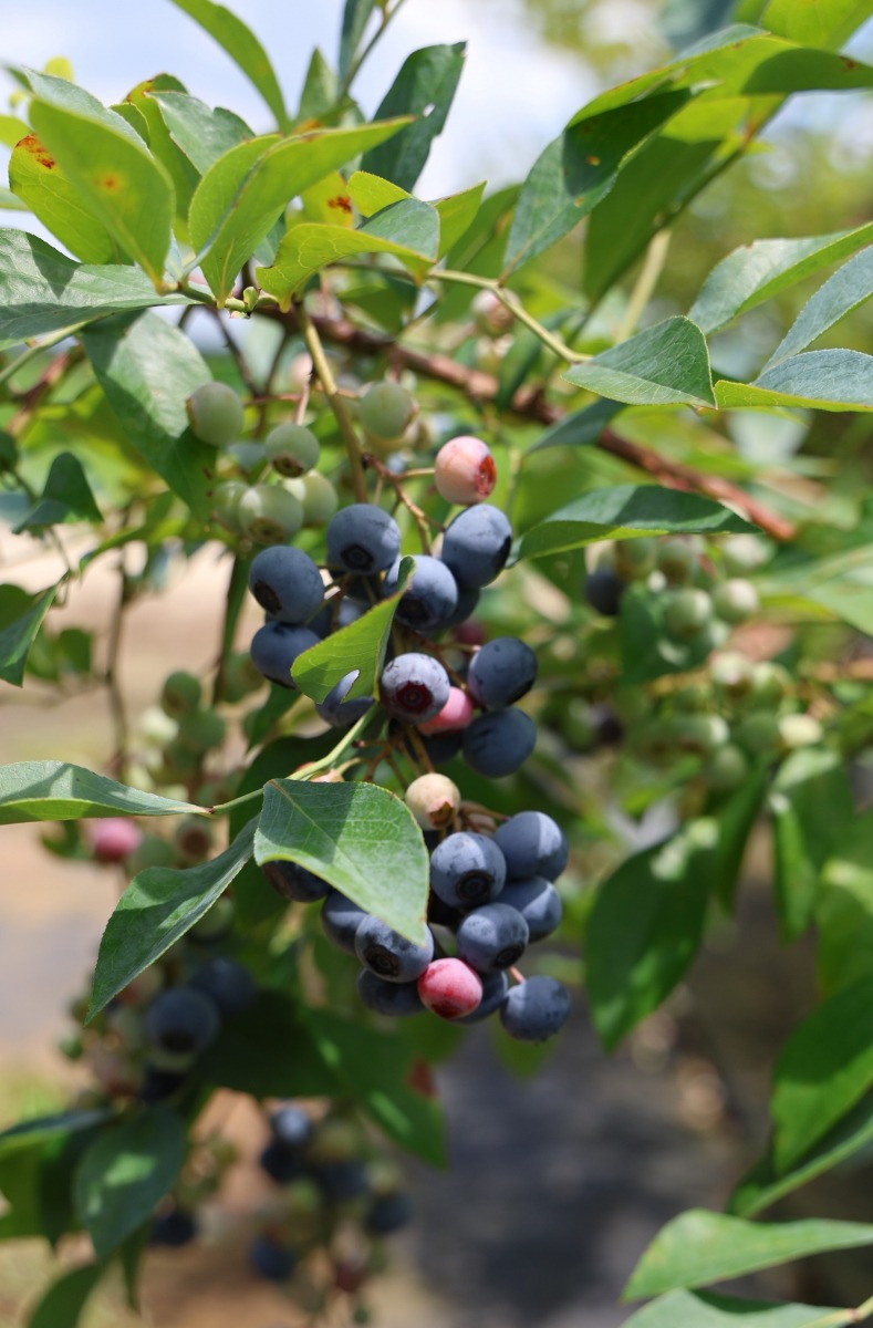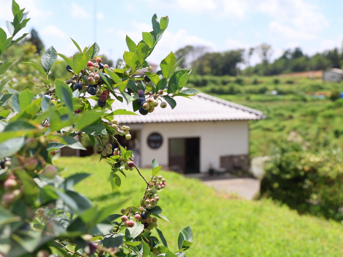 レストハウスの上の丘に第2農園があります。お山のてっぺんにあるので、見晴らしもよく、風もよく吹いていました。ブルーベリーの完熟の要素は、寒暖差、気候、ミツバチの受粉ですが、味見をすると納得の甘さでした。1つの房でも成長の速度が違うので、完熟した実と今から色づく実とがあります。