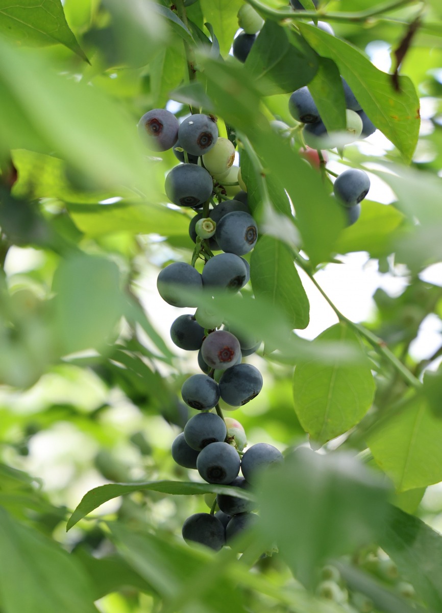 ブルーベリーの木は、さほど大きくなく、完熟したブルーベリーの実は下の方に垂れ下がるので、小さなお子さんでも自分で摘んで楽しむことができます。小さな手のほうが一粒を丁寧に摘めそうです。