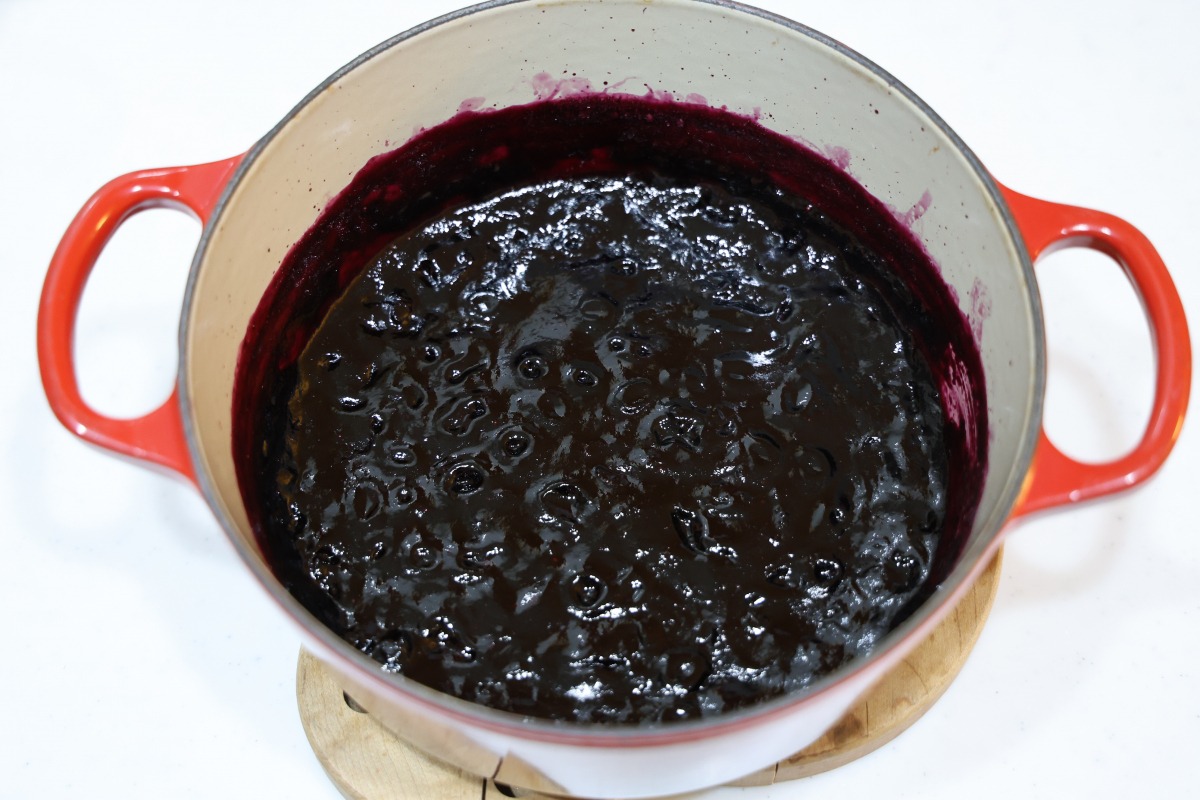 家に帰って、約3分の1(400グラム)のブルーベリーを使ってジャムを作ってみました。砂糖は半量の200グラムで、焦がさないように中火でアクを取りながら、ブルーベリーから出る水分で15分ほど煮詰め、レモン汁を大さじ2杯入れて混ぜてから火をとめました。ペクチン効果でとろみがついて、いい感じに仕上がりました。思ったよりも簡単!