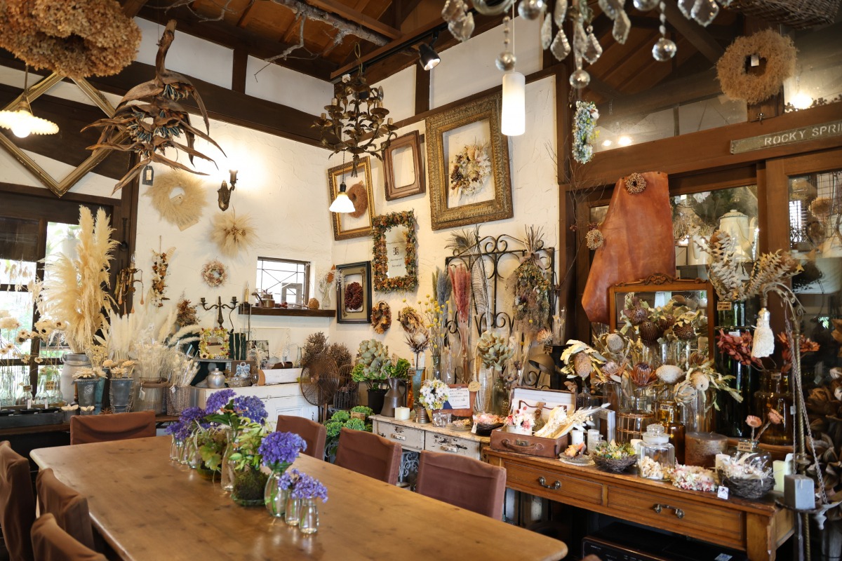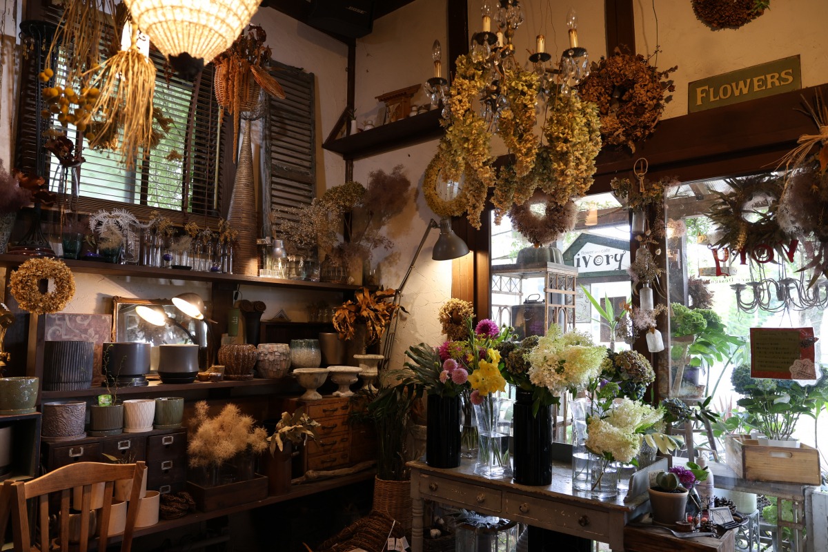 こちらはお花屋さんの経営するカフェで、店内に旬のお花やドライフラワーが並んでいます。