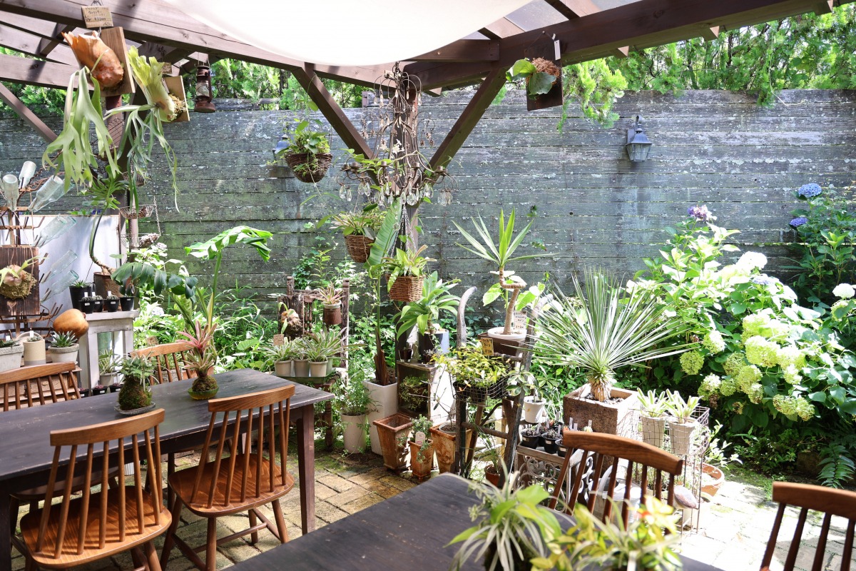 ウッドフェンスで囲まれたテラスには、観葉植物や多肉植物などが生き生きと育っていて、グリーンな空間になっています。
