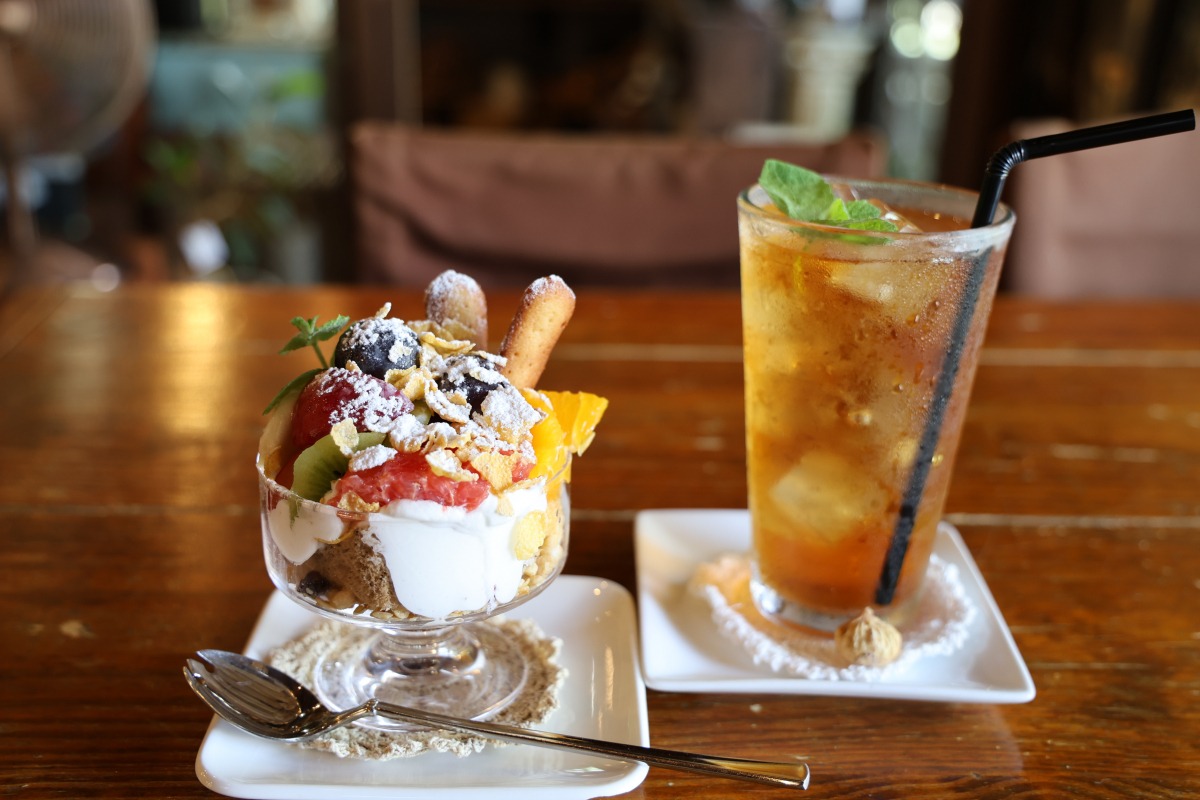 ブルーベリー狩りで2時間農園にいたので、干からびた身体にパフェとドリンクが効きました!ミニパフェはボリュームがあり、アイスクリームでクールダウンもできました。アイスティーは、かなり大きめのグラスでしたが、おかげで身体が潤いました。「西田農園」からの帰り道にあるので、おすすめです!