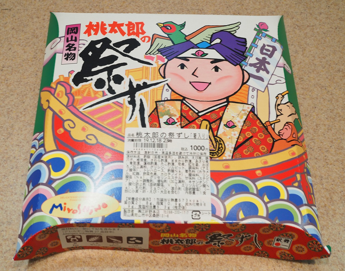 まずは「桃太郎の祭りずし」。岡山といえば、桃太郎! 桃太郎の絵柄がインパクト大の駅弁です。