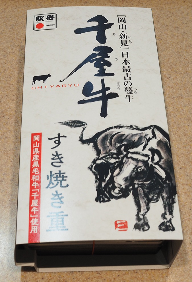 「千屋牛すき焼き重」。パッケージには、千屋牛の説明もしっかりと掲載されていました。