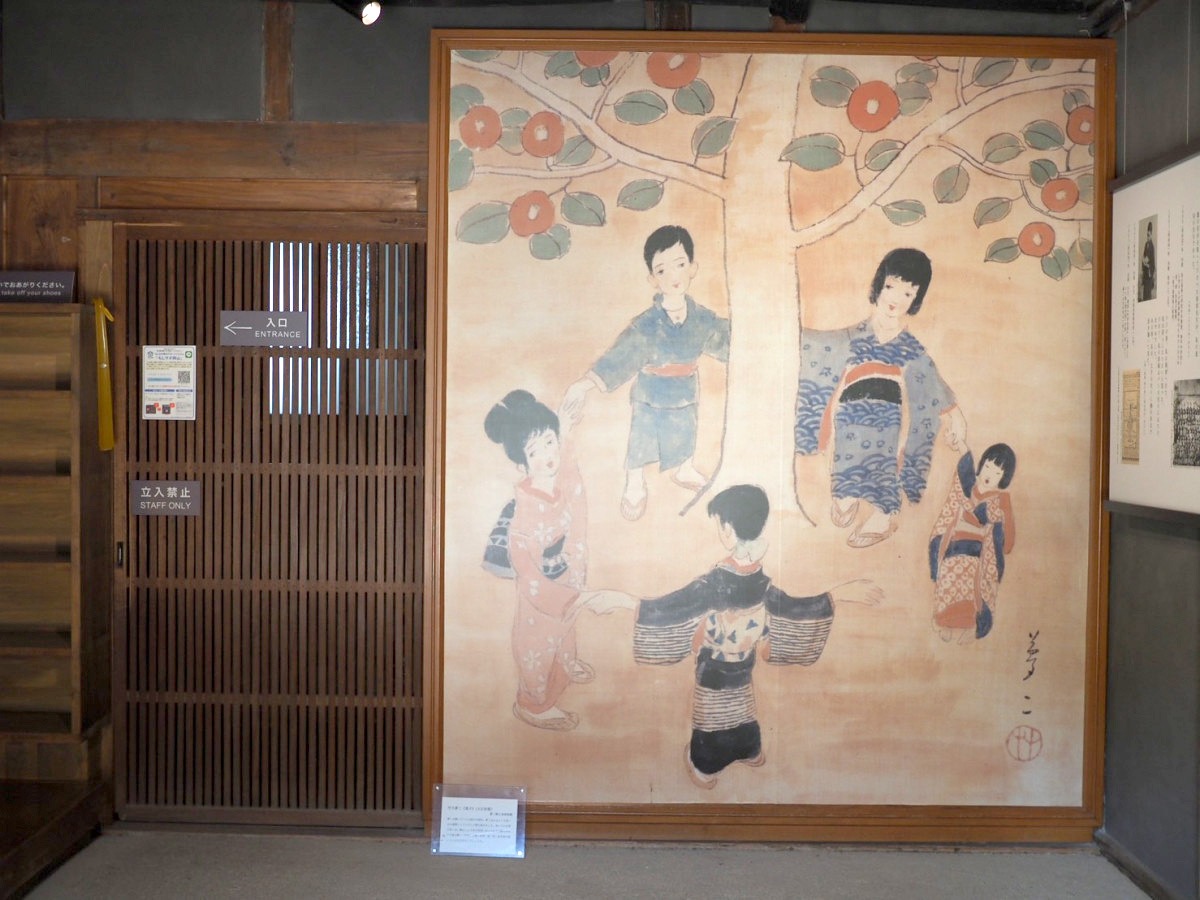 また、大正初期の夢二の代表作「童子」が展示されていました。大きな椿の木を囲んで仲睦まじく遊ぶ様子。着物の描写も素敵です。邑久町での自分の幼少期を思い起こしながら描かれたといわれています。
