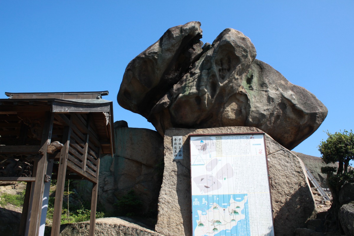 住吉港から約8km、瀬戸内海の中央に飛び石状に浮かぶ笠岡諸島最北端に位置し、国の名勝に指定されている島。瀬戸内海の潮流の集中する所といわれ、「古事記」に記された神武天皇東征の途中に行在所が置かれた伝説地として知られています。随所に花崗岩が露出している海抜77mの神卜山からは素晴らしい景色が望めます。
