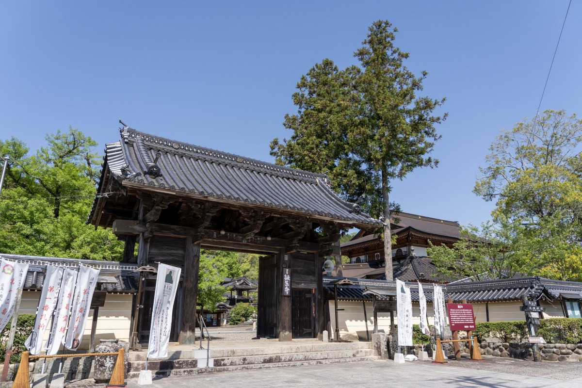 浄土宗の開祖、法然上人の生家跡に建つ寺。1193年(建久4年)建立で山門・筋塀・御影堂・阿弥陀堂・宝物館、別院の浄土院などがあります。1716年(正徳6年)建造の山門は浄土宗寺院の中では比較的例の少ない山門薬医門の典型的な様式。装飾的にも優れた特色を持つ非常に価値の高い建築物です。御影堂は1695年(元禄8年)に再建された由緒ある二重の五間堂の寺院建築で、正面に唐破風造の向拝を持ち、浄土宗における仏堂型本堂の中でも本格的なものとして建築史的にも貴重な建物です。その御影堂を浄土とし、およそ300m先にある娑婆堂を現実世界、再び御影堂に帰るという「二十五菩薩練供養」は日本三大練供養の一つに数えられ、毎年4月第3日曜日に行われている伝統行事で、法然上人の両親を浄土に迎え入れる祭事です。二十五菩薩が身にまとう法衣、冠、菩薩面の後光、手に持つ楽器はいづれも元禄時代から伝わる由緒あるものです。信徒らは装束を身にまとい、誕生寺の僧によるお清めを受けてから練供養に臨みます。