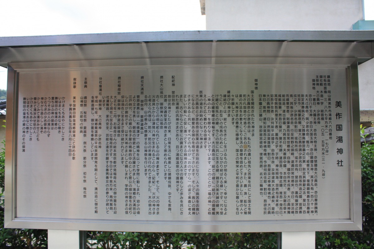 古くはそれぞれ別に奉られていましたが長い歴史の過程で「湯神社」として同じ本殿、或いは同じ境内に祀られるようになりました。本殿・併殿・拝殿からなる385年ぶりに改築された社殿を中心に、敷地内には薬師堂、稲荷、円仁法師像などがあり、藤、紅葉など四季折々の美しい風景を楽しめます。