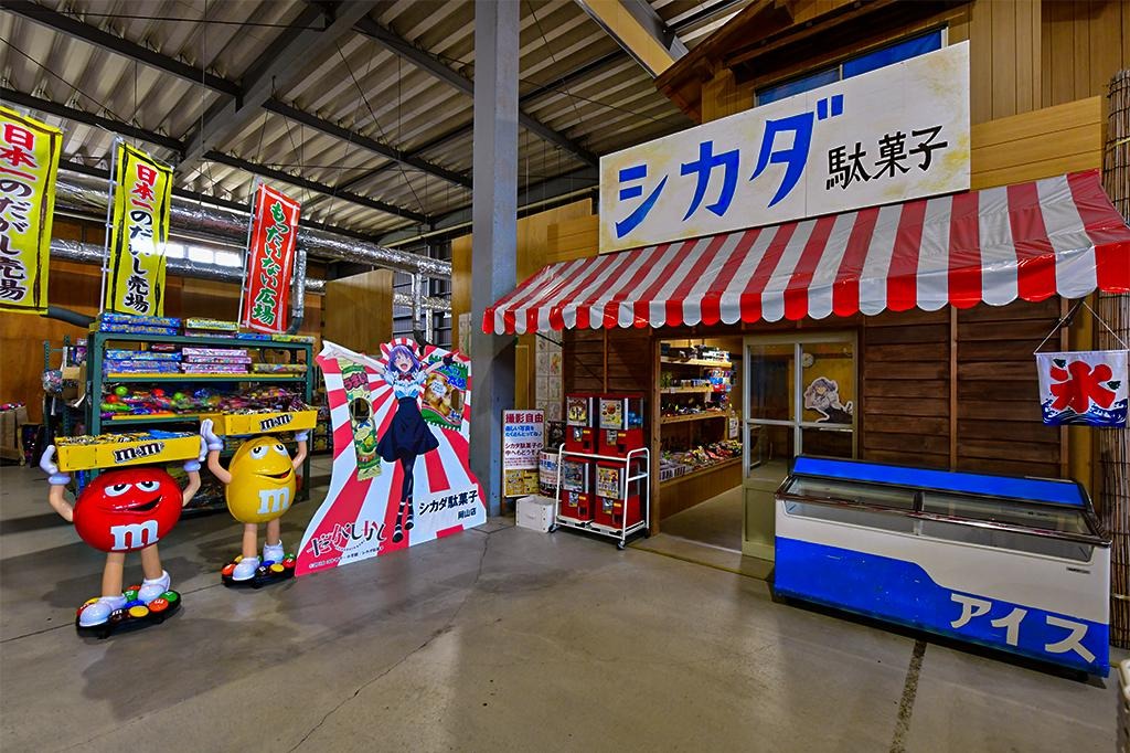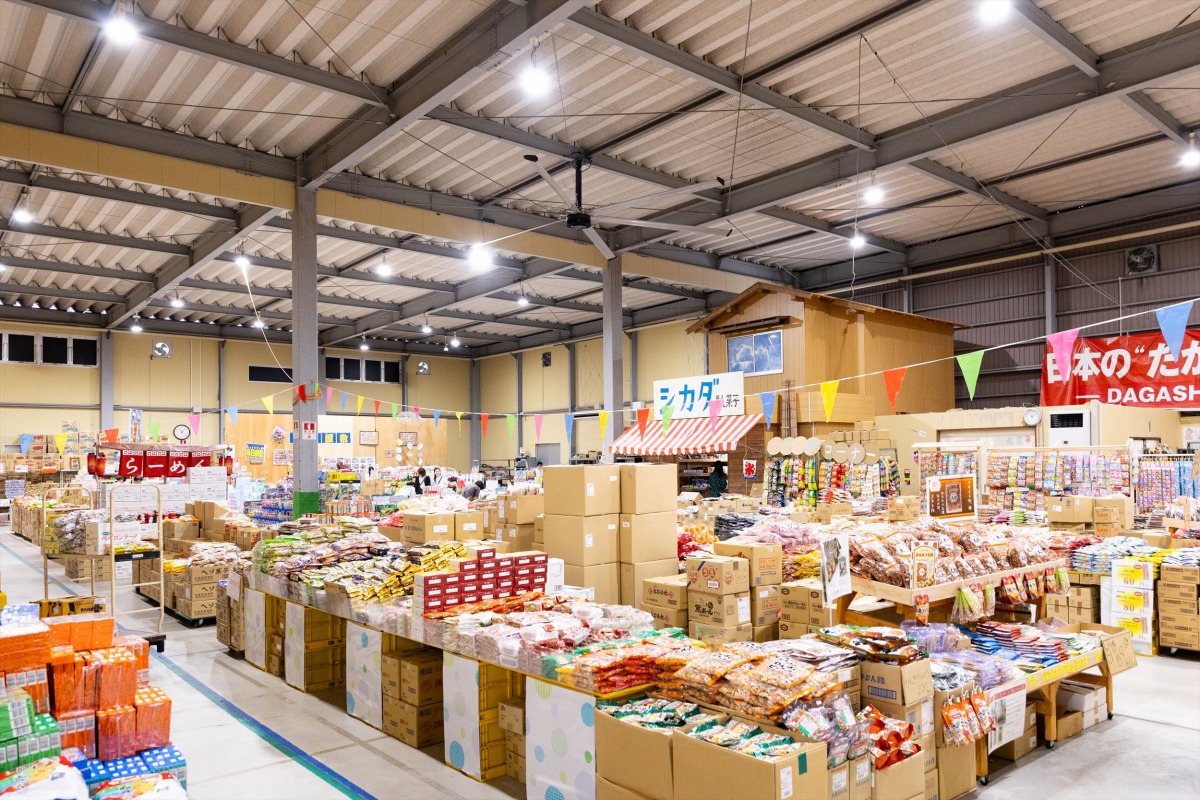 子ども好きな社長が、子どもを喜ばせることに全力で取り組むだがし屋。店内に菓子と玩具を合わせて約5,000種類が並ぶ「だがしコーナー」では、10円コーナーや懐かしコーナー、大人買いコーナーなどがあり、「縁日屋敷」では、花火や水鉄砲、お面やスーパーボールなどがあります。