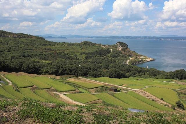 豊島には「豊島美術館」「豊島横尾館」などがあり、直島とともに現代アートの島として知られています。なだらかな島の斜面に広がる美しい唐櫃(からと)の棚田や、青い海と白い砂浜が広がる神子ヶ浜などの海水浴場など、美しい自然も満喫できます。