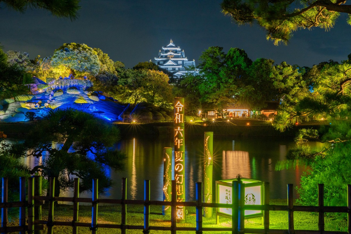 岡山藩2代目藩主・池田綱政(つなまさ)が自ら憩いの場として築いた大庭園。季節の花が彩る広々とした園内は江戸時代さながらの別世界。1952年には歴史的文化遺産として“特別名勝”に指定され、ミシュラン・グリーンガイド・ジャポンでは三つ星の評価を得ています。四季を通じて茶つみや月見など様々な行事が催されているほか、期間限定で昼間とは趣を変えて園内をライトアップする夜間特別開園「幻想庭園」を楽しむことができます。