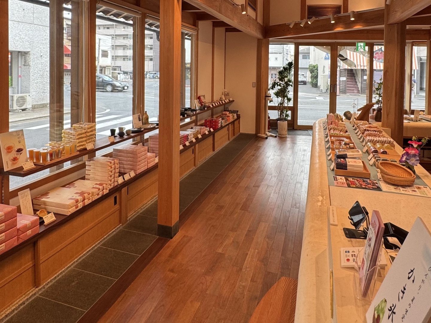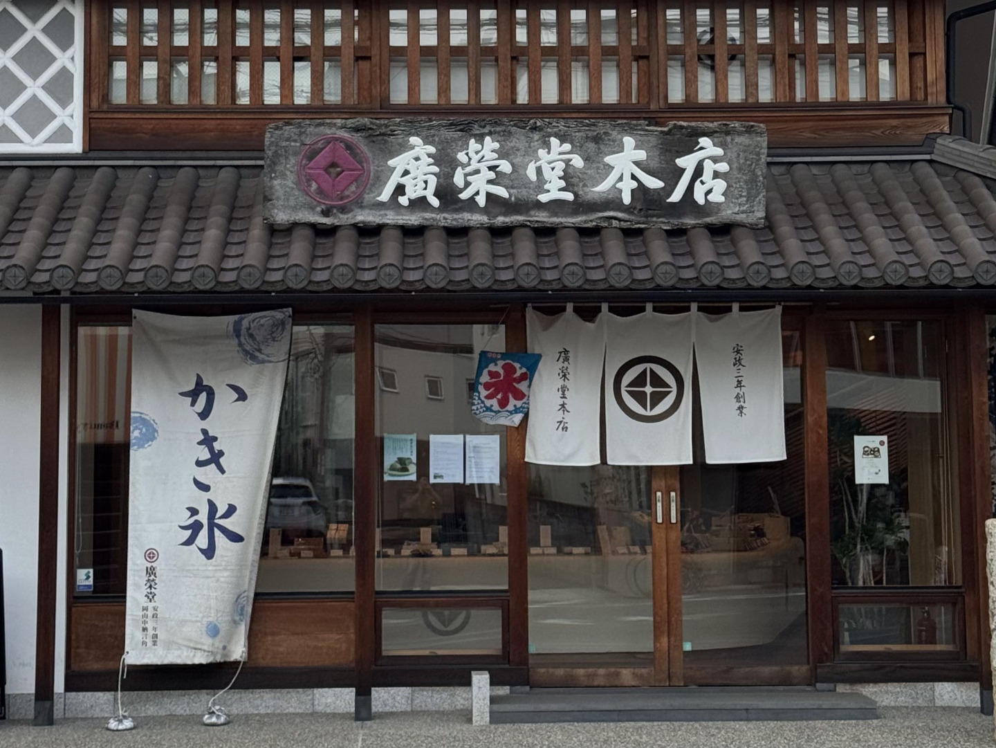 創業160年を越える廣榮堂は中納言の地から始まり、2019年12月にリニューアルオープン。木の温もりの中で四季折々のお菓子とお茶を楽しめる「廣榮堂茶房 ひねもす」をはじめ、一杯のお茶とお菓子で特別な時間を過ごせる「茶室」、和菓子作りに専念し職人道を極める空間として「工房」を併設。