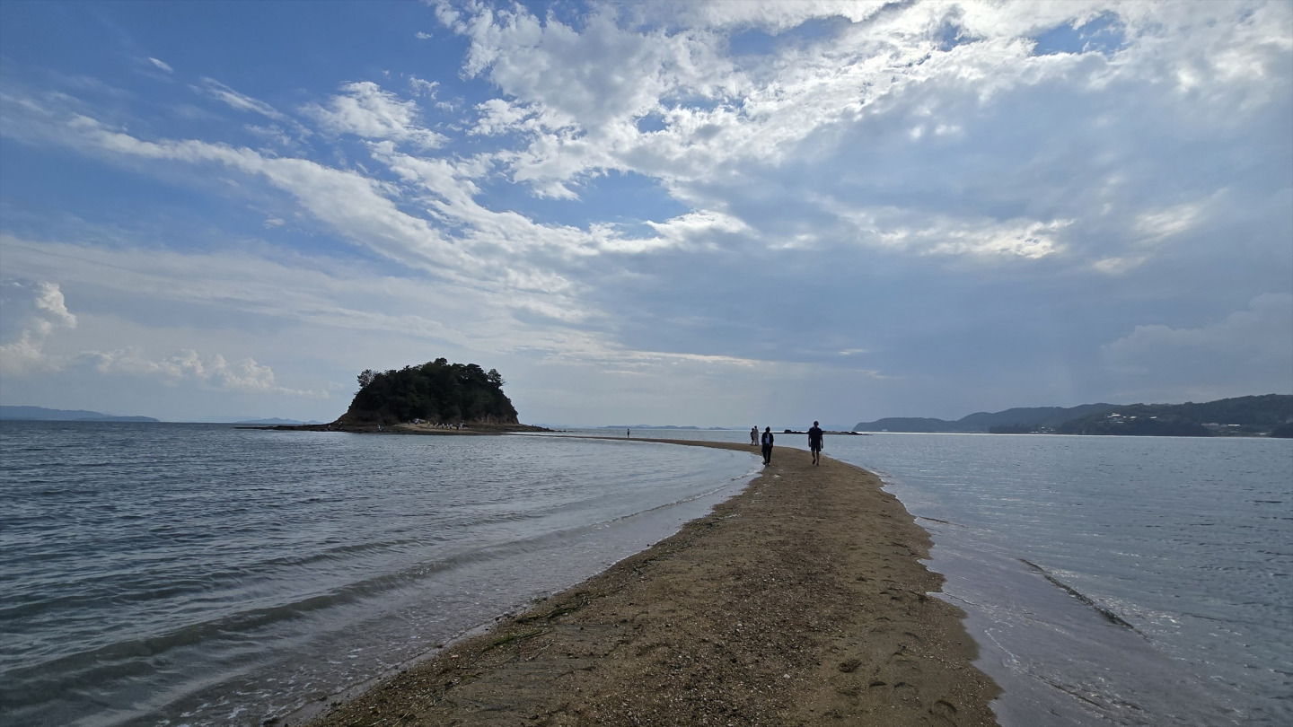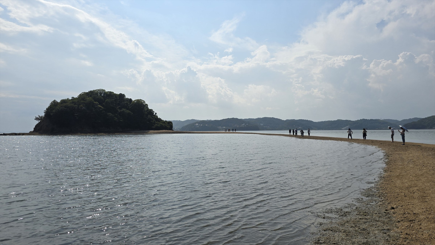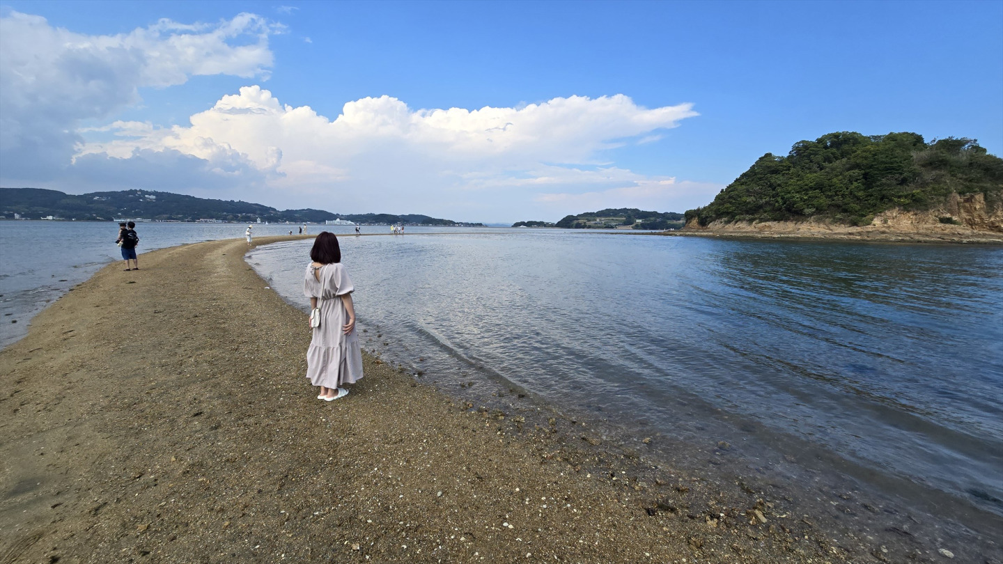 3つ島が繋がる「砂の道」が現れるの。隠れ映えスポット!