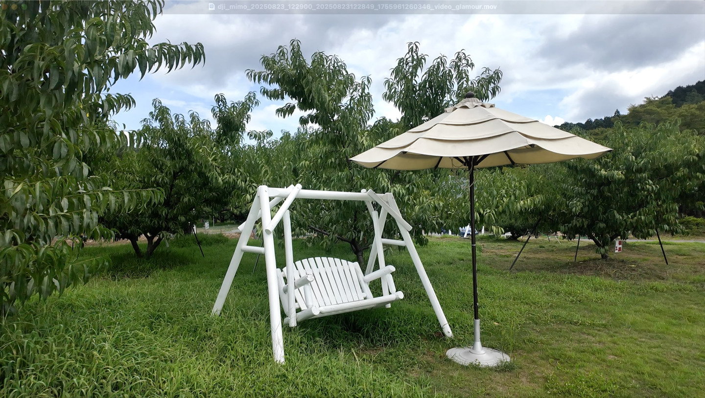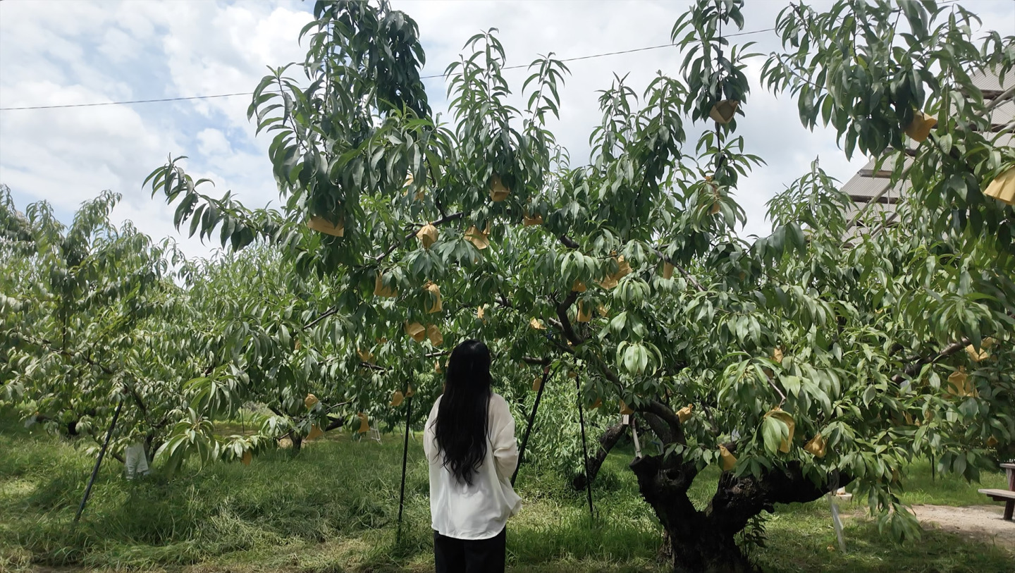 売店で購入した桃スムージーを片手に、農園のベンチでのんびりおしゃべり!