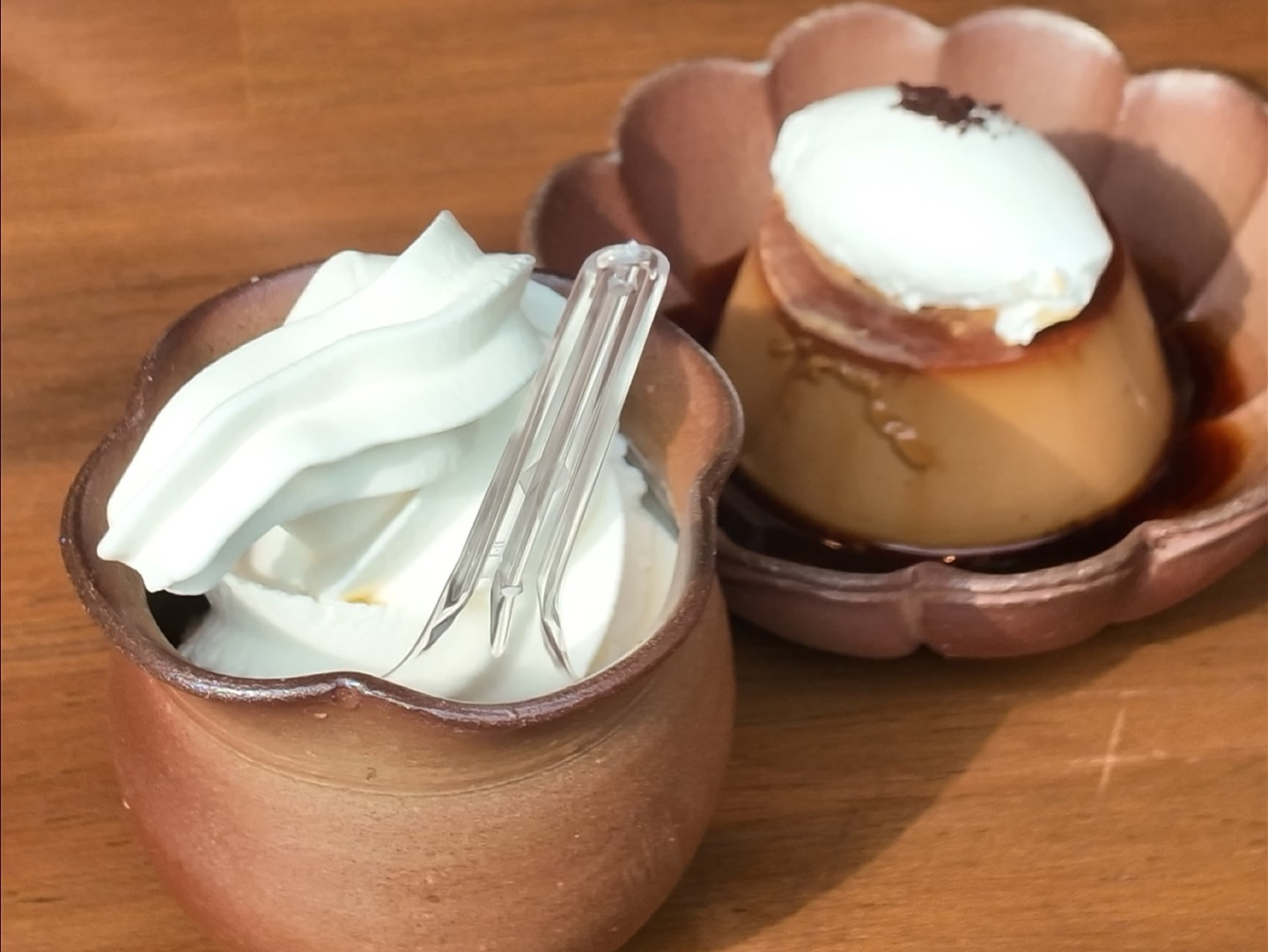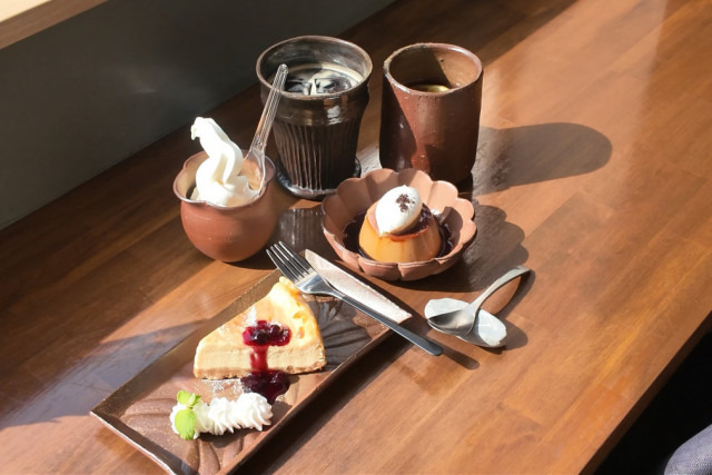 スイーツやドリンクが備前焼の器に盛り付けられたおしゃれなカフェで、絶品プリンとチーズケーキ、ソフトクリームをいただきました。