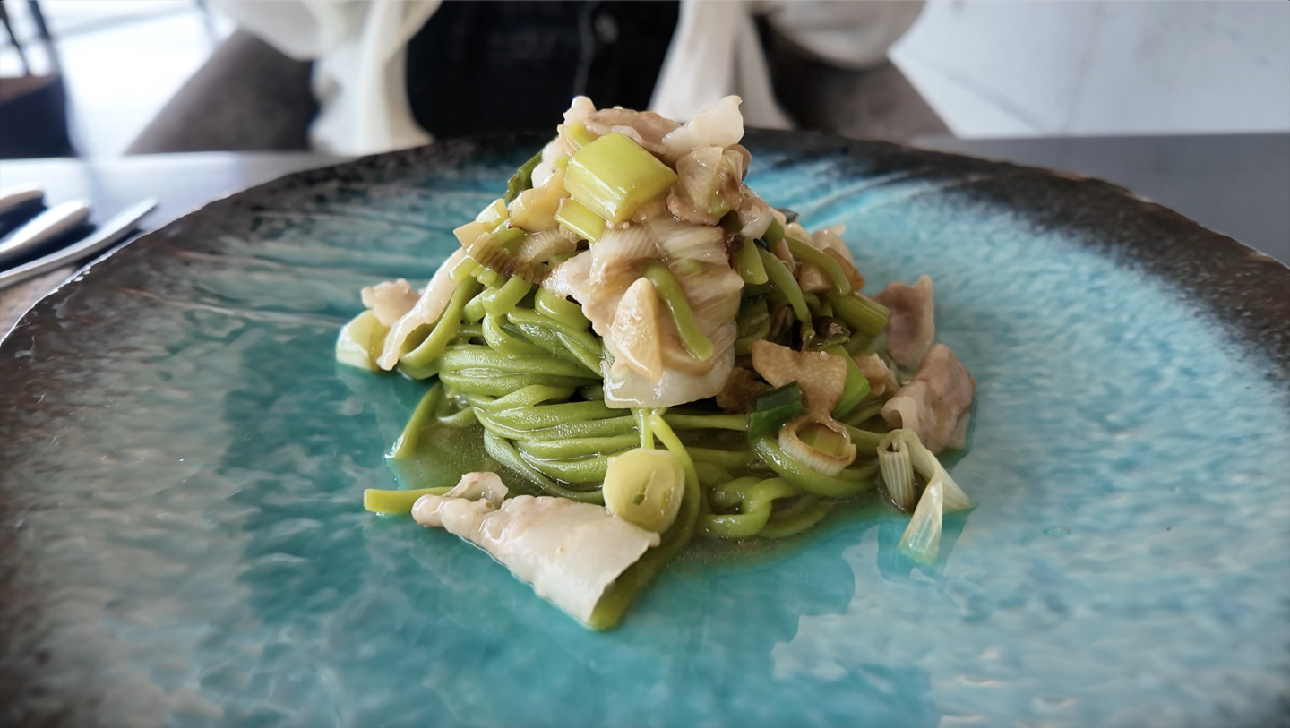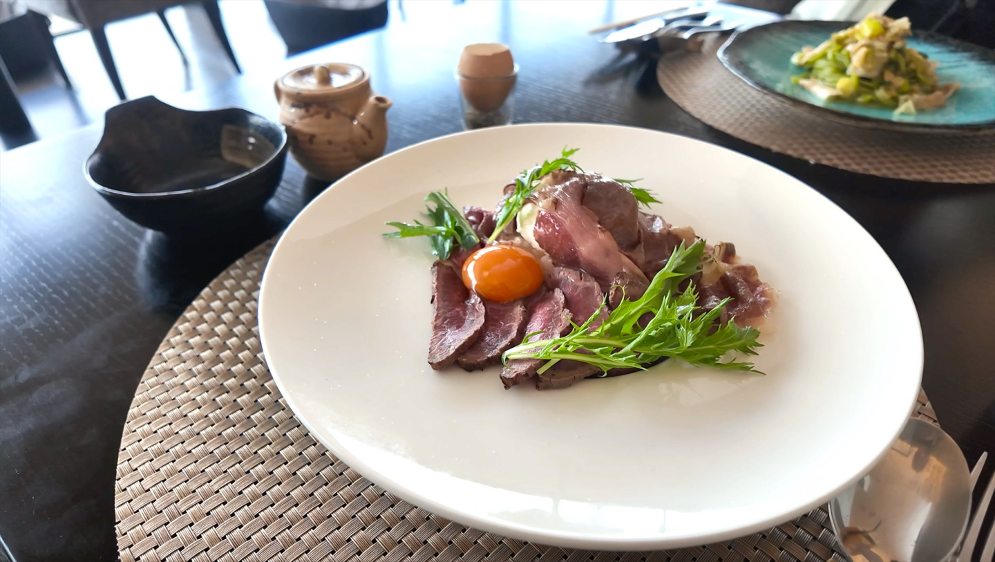 「大きな窓から海が見えるレストランで、黒毛和牛A5ランクのひつまぶしと、ほうれん草のパスタを食べたよ!