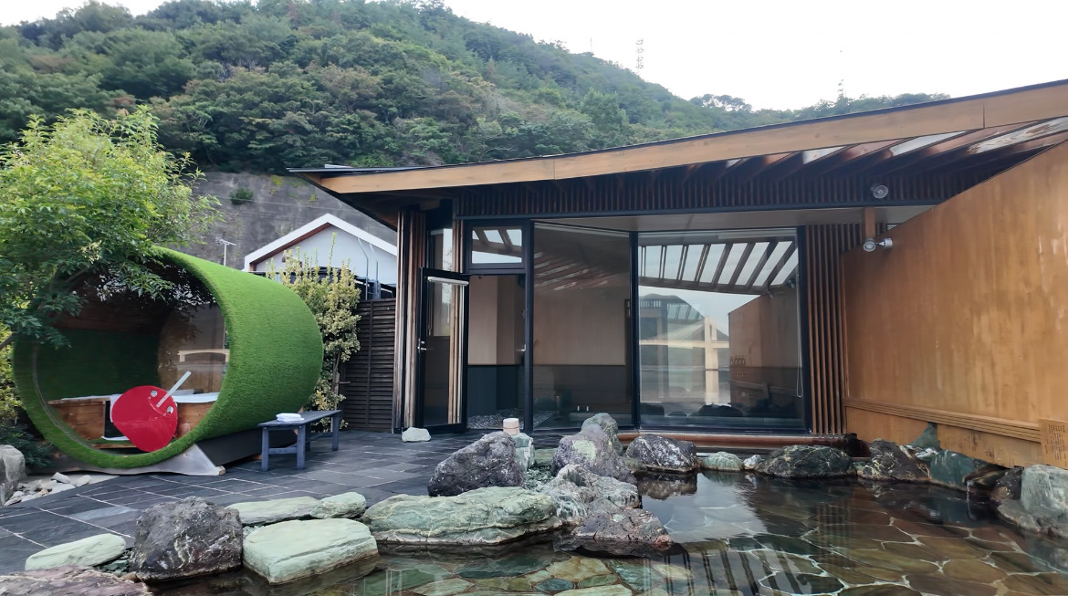 「食後は温泉でのんびりリラックス。レストランから徒歩3分の貸切温泉へ移動。