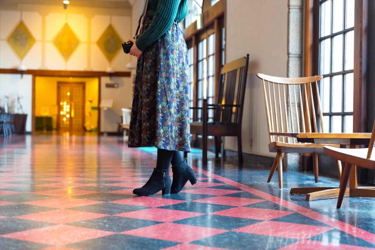 玄関の巨大な柱は、一見大理石に見えますが実は鉄筋コンクリート造で、石の粉をモルタルに混ぜており、左官技術によって施されています。