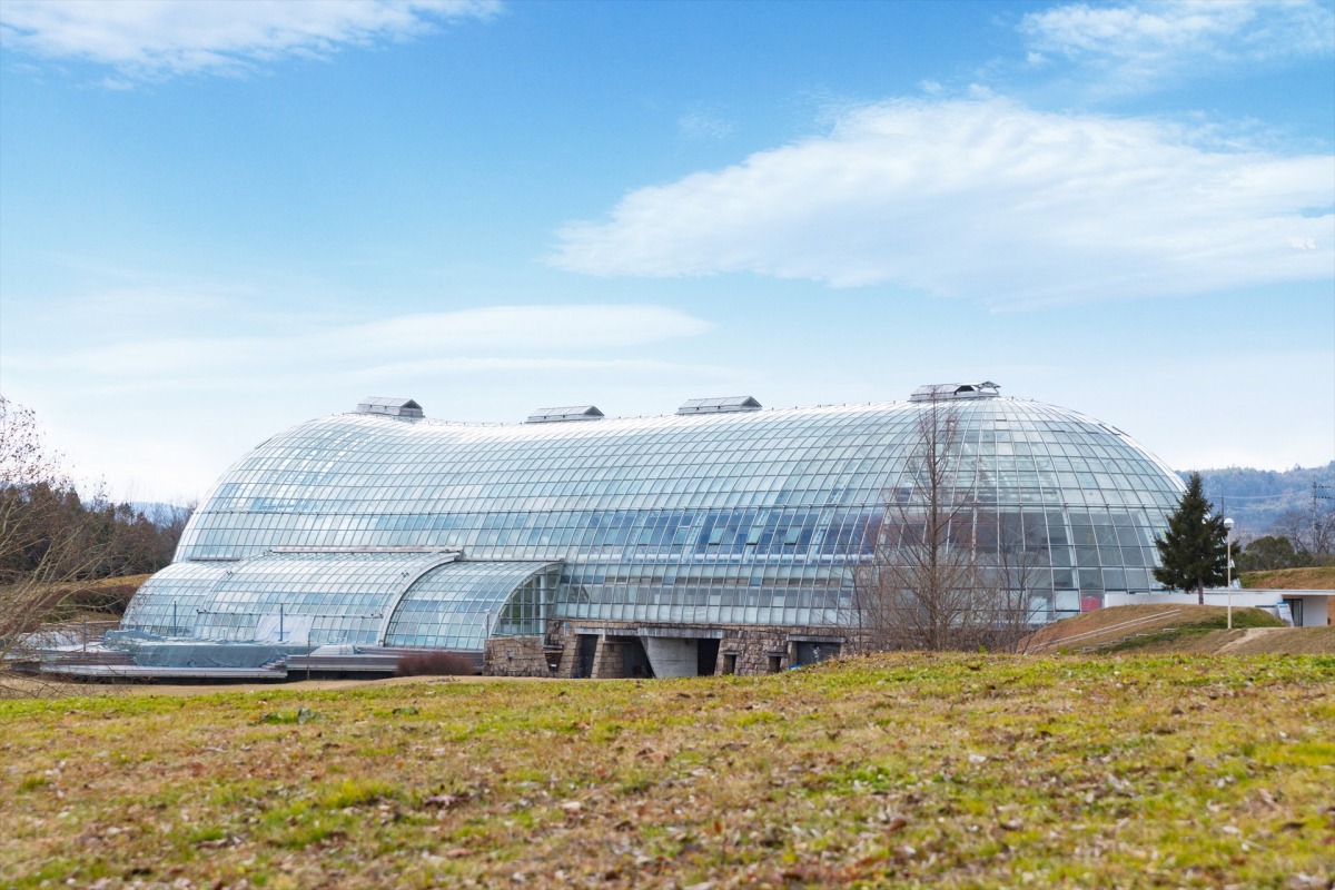 総ガラス張りの柔らかな曲線で形成された外観が、稜線が重なる周囲の地形と調和しています。