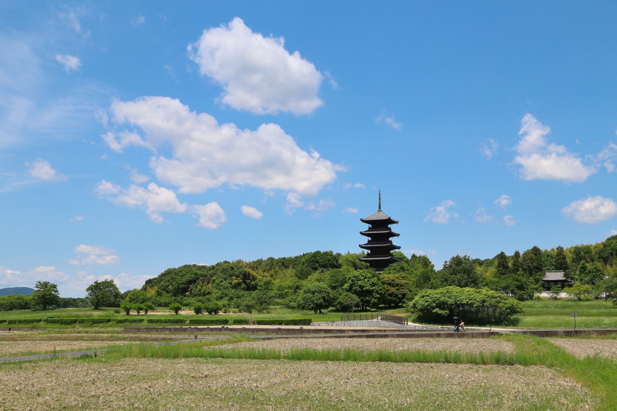 奈良時代に聖武天皇の発願によって全国に建立された国分寺のひとつ。仏教の力を借りて天災や飢饉(ききん)から国を守ることを目的に建てられました。現在残っている建物は江戸時代に再興されたもの。境内には高さ約34mの五重塔がそびえ、吉備路を代表する景観として有名です。岡山県唯一の五重塔は重要文化財に指定されています。田園風景の中に建つ五重塔や、菜の花、レンゲ、ひまわりなどの写真撮影をしたり、サイクリングスポットとしての人気が高まっています。