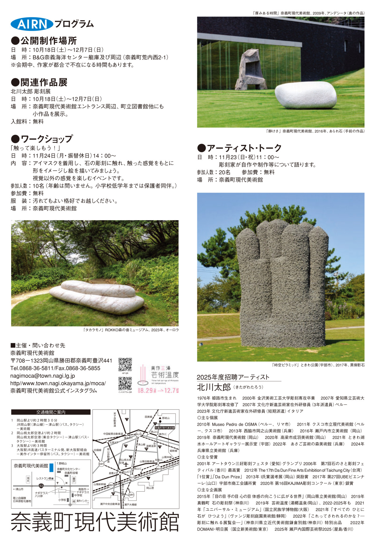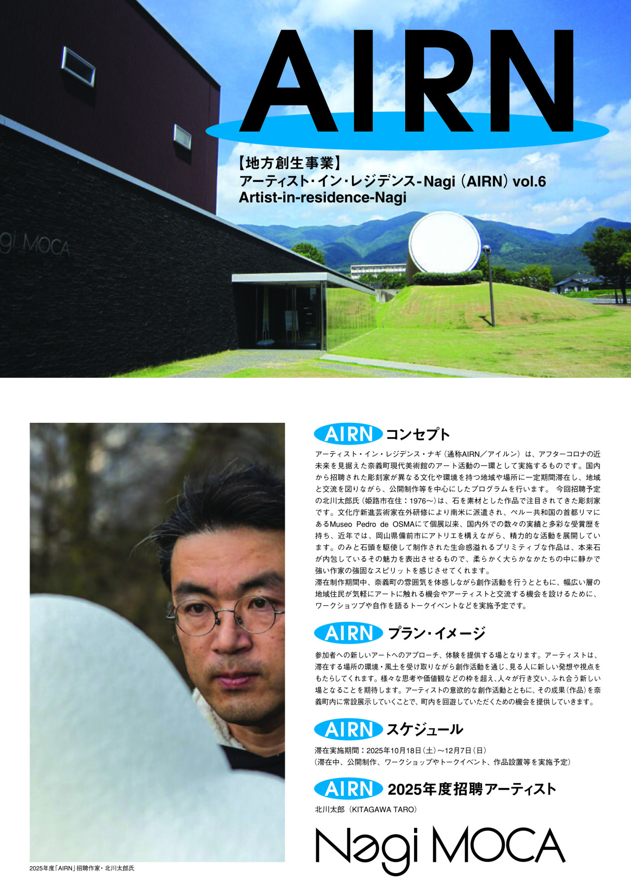 アーティスト・イン・レジデンス・ナギ(通称AIRN/アイルン)vol.6では、彫刻家の北川太郎さんが招かれ、一定期間奈義町に滞在しながらその暮らしや奈義の風土に触れながら作品を制作されます。