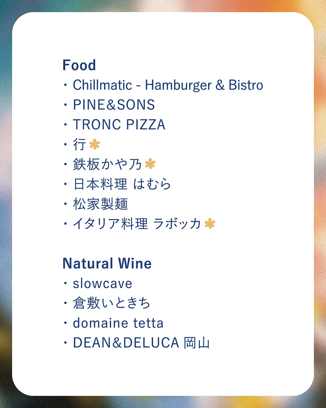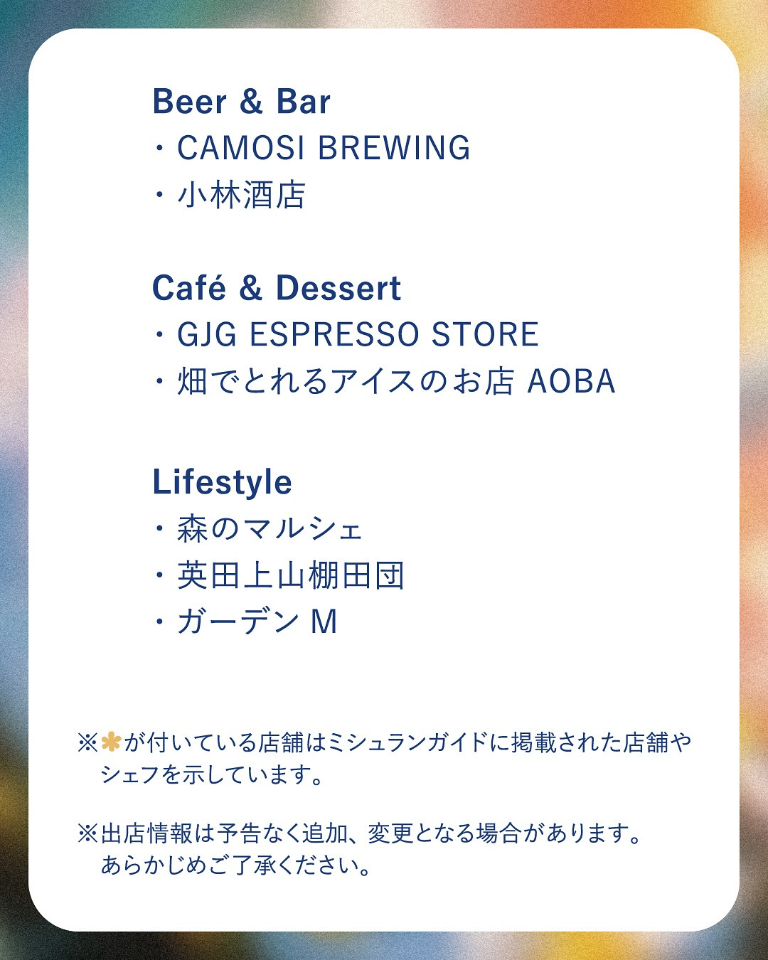 会場には、ミシュランシェフが手がけるサーロインステーキやイタリアン、焼き鳥に加え、ベーカリー&ドーナツ、ナチュラルワインやクラフトビールまで、選りすぐりの店舗が出店。また、世界基準の音響システムを搭載するトレーラーで県内の実力派DJによる心地よい音楽とともに楽しめます。