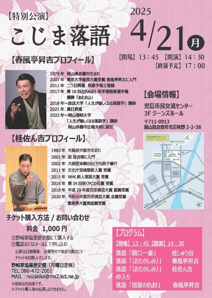 岡山県赤磐市出身の落語家・春風亭昇吉氏と、落語家の桂 佐ん吉氏と桂しゅう治、お囃子に井手窪泉氏を迎えての公演です。