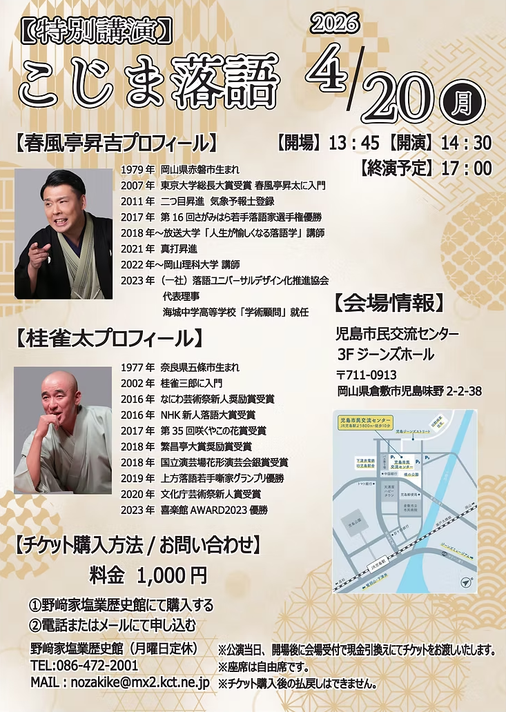 児島市民交流センター 3F ジーンズホールにて「こじま落語」が開催されます。