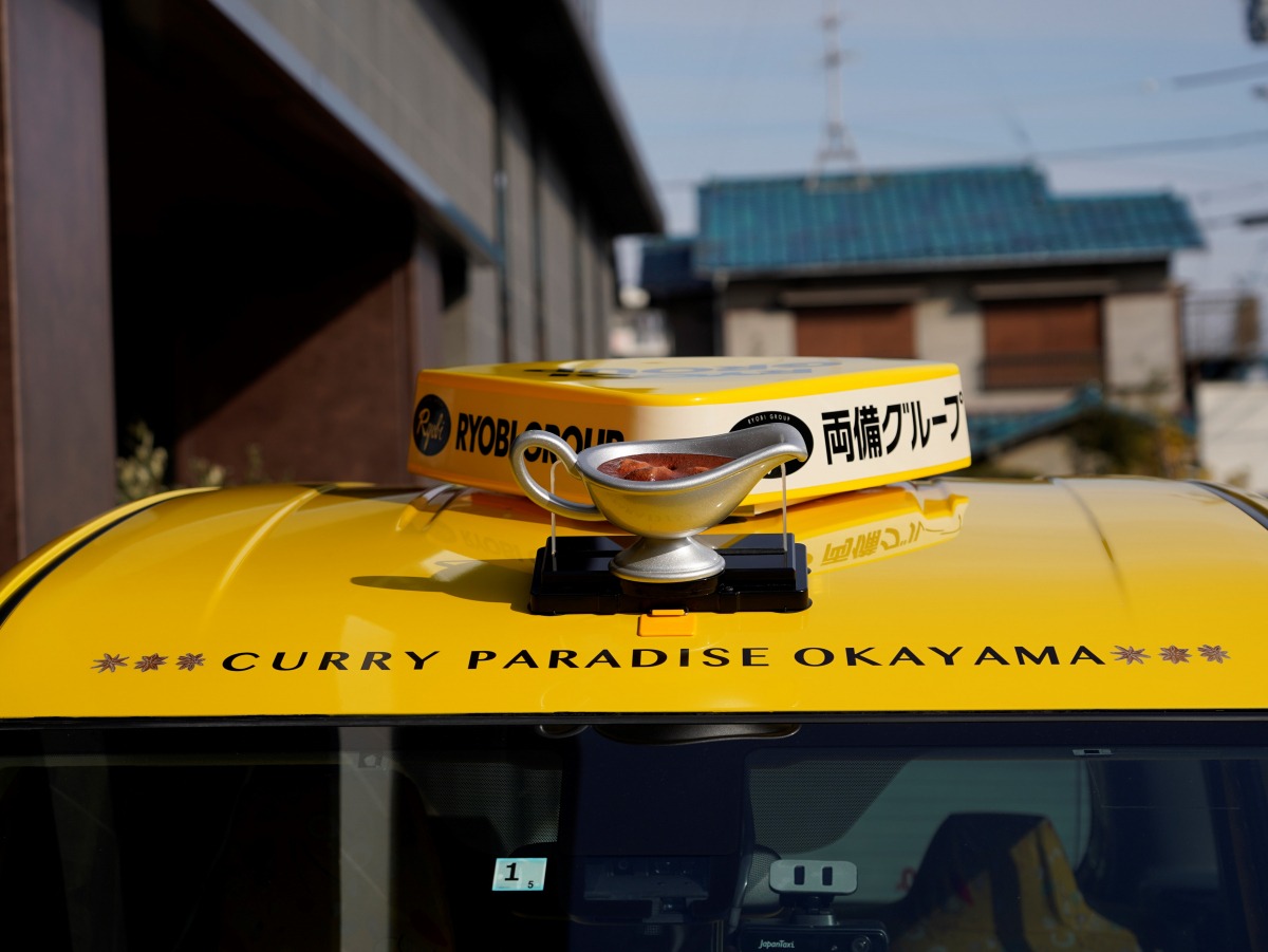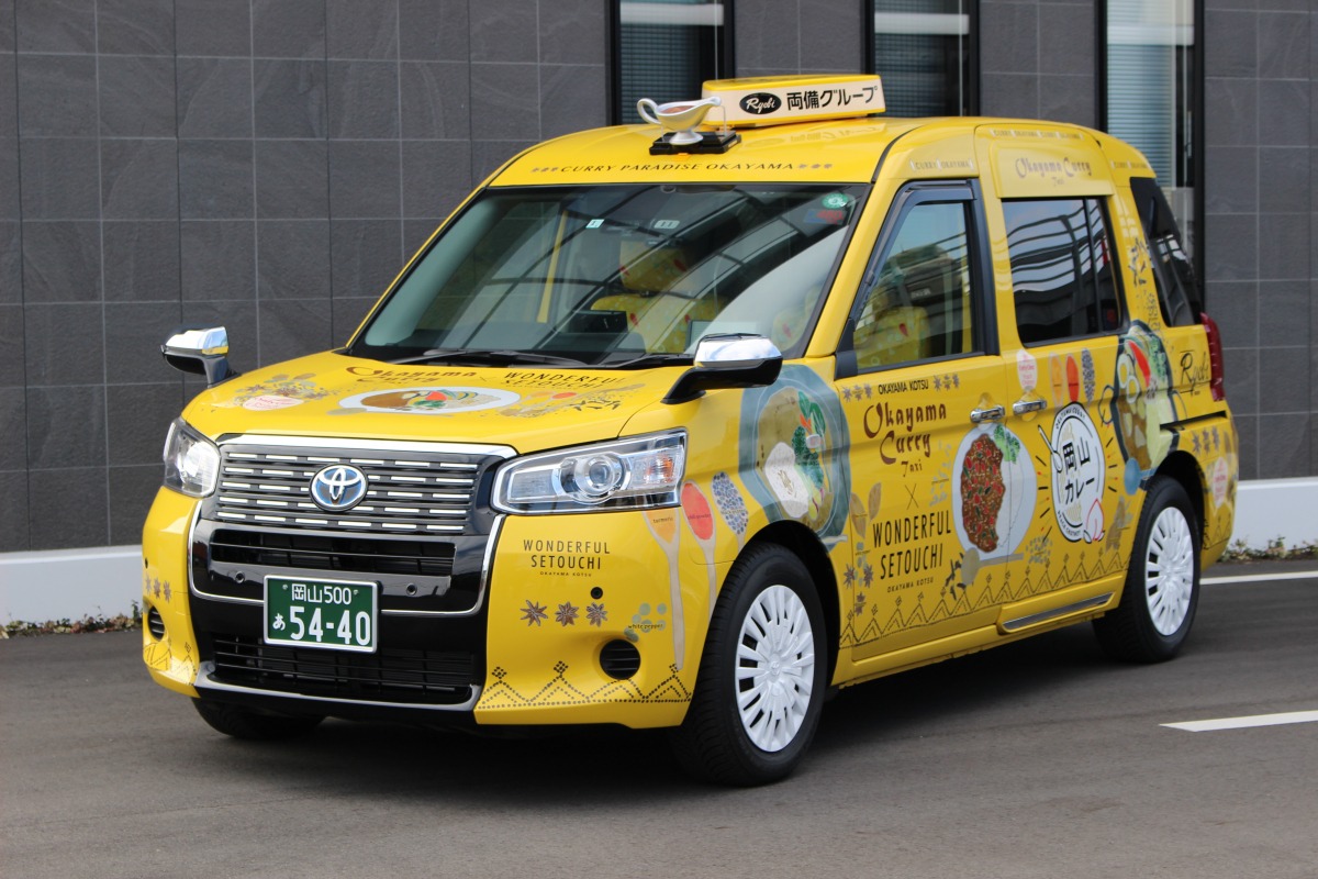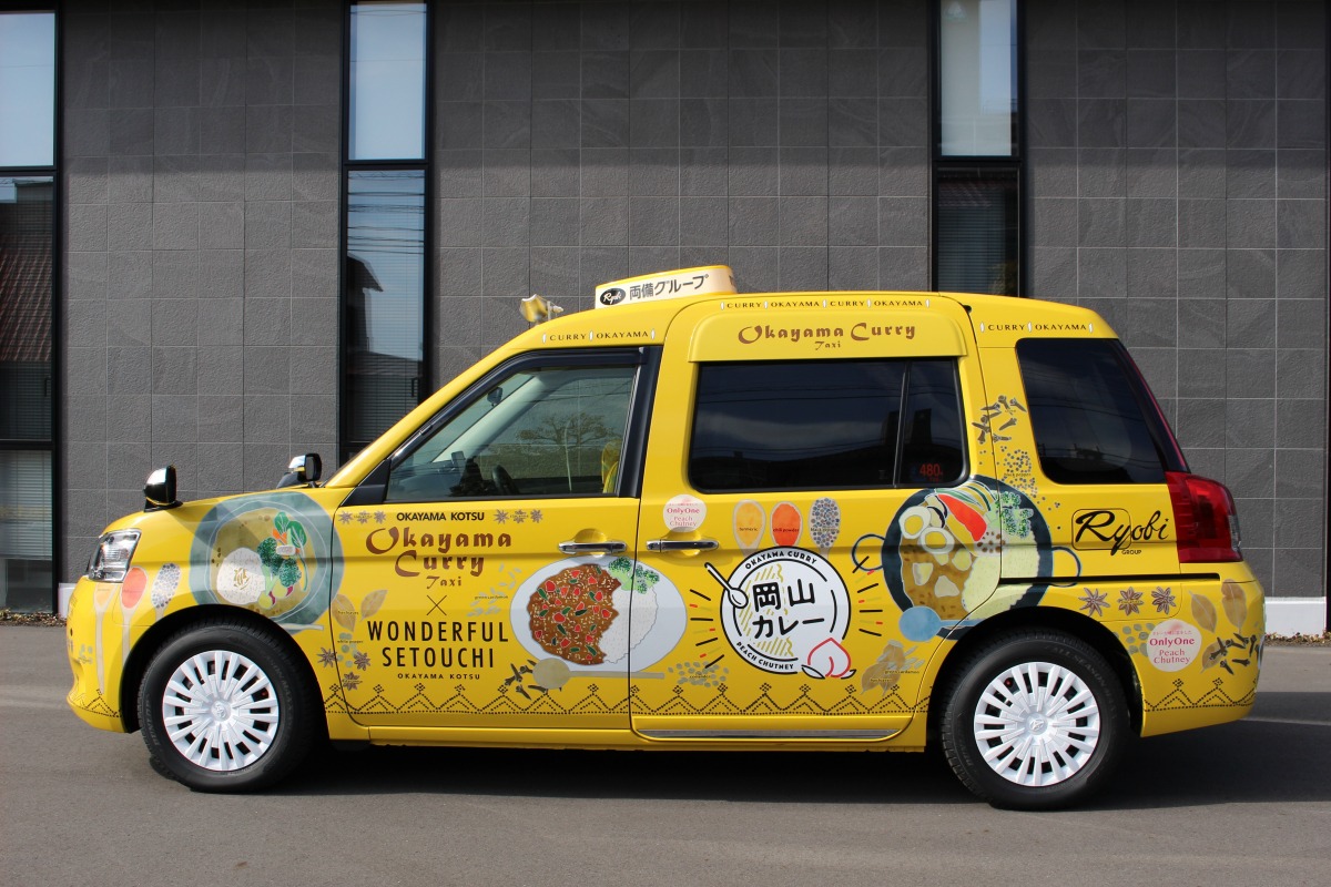 岡山を代表するフルーツ「桃」のチャツネを使用した「岡山カレー」をイメージしたラッピングタクシー。