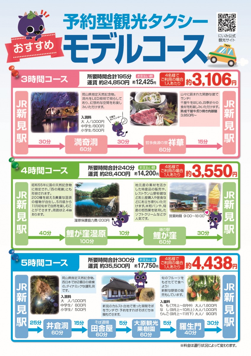 新見市を訪れる観光客の皆様に、市内の観光地を充分に周遊してもらうことを目的として、市内観光及び食事・宿泊等にタクシーを利用した場合、1/2(半額)の運賃で乗車できる予約型観光タクシーです。(助成上限20,000円)
