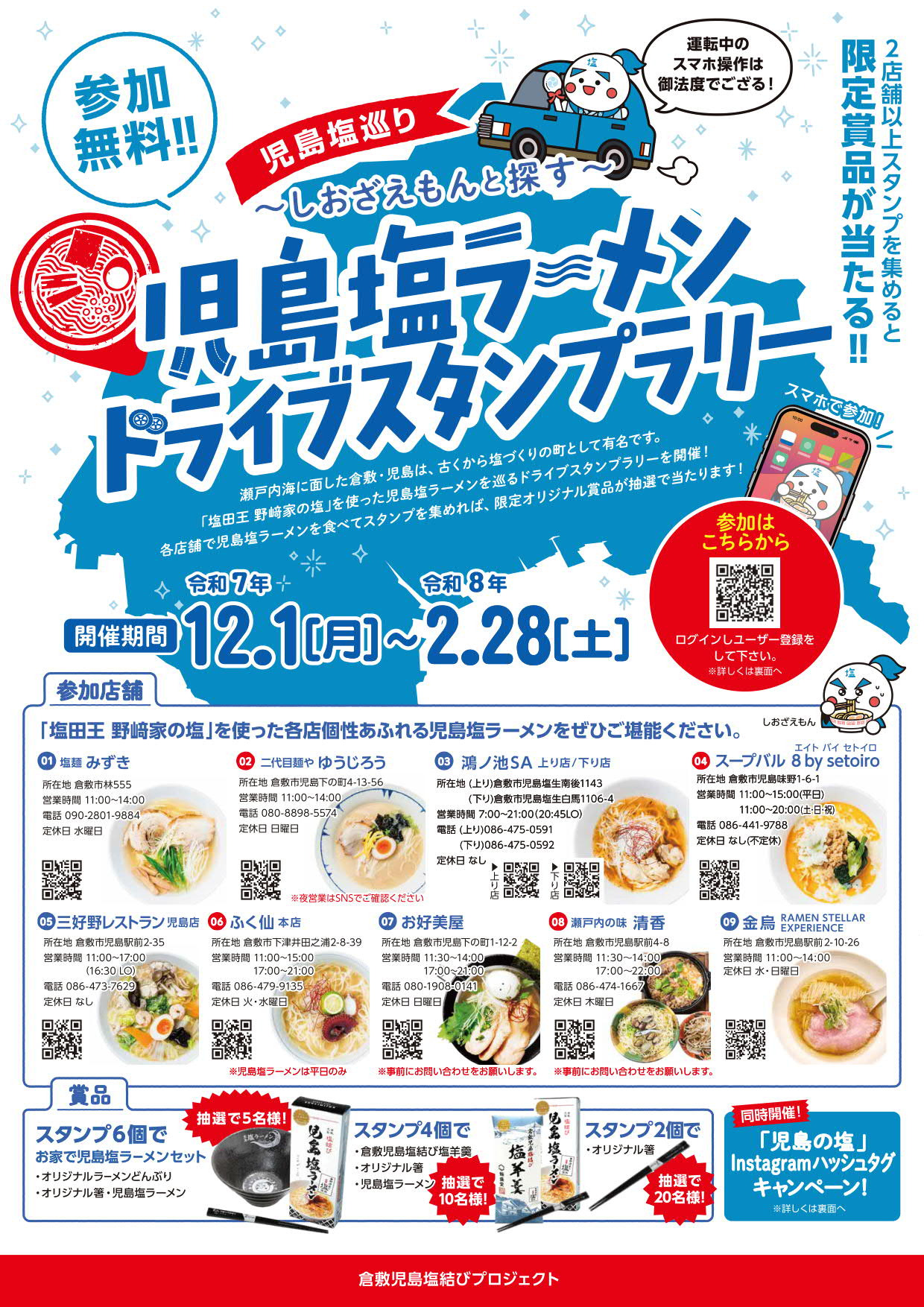 瀬戸内海に面した倉敷・児島は、古くから塩づくりの町として有名です。『塩田王 野﨑家の塩』を使った児島塩ラーメンを巡るドライブスタンプラリーが開催されます。各店舗で児島塩ラーメンを食べてスタンプを集めると、限定オリジナル賞品が抽選で当たります。美味しい児島塩ラーメンを堪能し、児島の美しい景色を見て感じて、瀬戸内の魅力を存分に楽しめます。