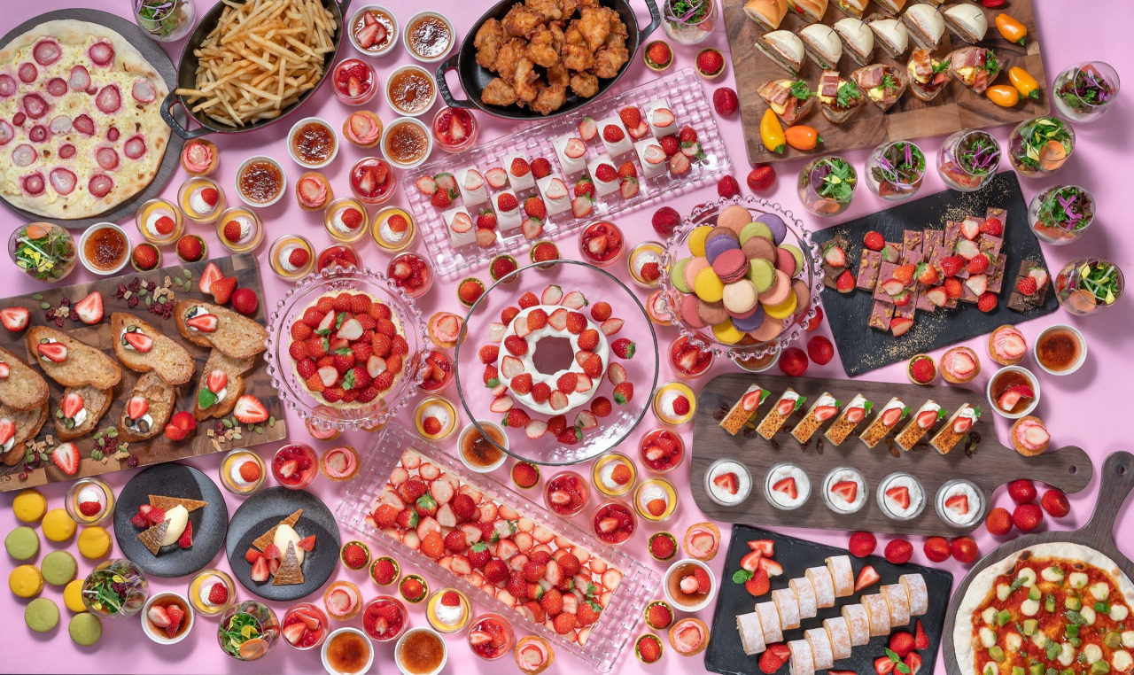 さらに、甘さだけではない苺の魅力を堪能できる、苺を使用した冷製セイボリーが用意されます。幅広い世代の方が楽しめるよう、シェフおすすめのショートパスタや牛肉の赤ワイン煮込みをはじめとした温製セイボリーも充実しており、甘いスイーツの合間にも満足できるイベントです。香りまで甘く華やぐ空間で、心躍る週末だけの食べ放題体験を存分に楽しめます。