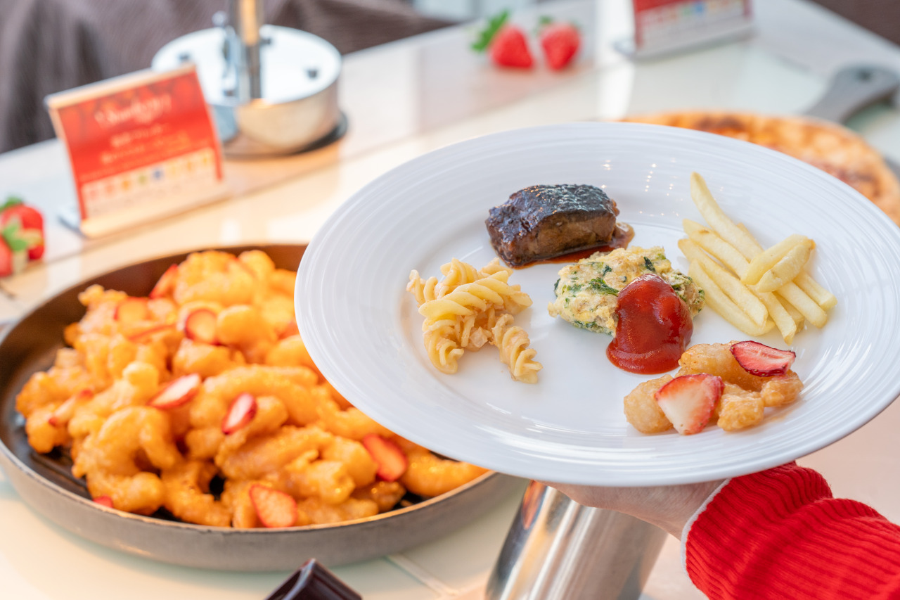 ブッフェ台にはショートケーキやタルト、ムース、クッキー、マカロンに至るまで、彩り豊かな13種類の苺スイーツがまるで宝石のように並びます。ライブキッチンでは、ジューシーなローストビーフを目の前で切り分け、甘酸っぱい苺のピッツァは出来立てが提供されます。さらに、甘さだけではない苺の魅力を堪能できる、苺を使用した冷製セイボリーが用意されます。幅広い世代の方が楽しめるよう、シェフおすすめのショートパスタや牛肉の赤ワイン煮込みをはじめとした温製セイボリーも充実しており、甘いスイーツの合間にも満足できるイベントです。香りまで甘く華やぐ空間で、心躍る食べ放題体験を存分に楽しめます。