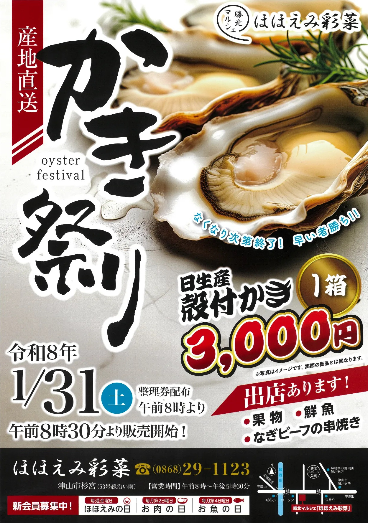 岡山県津山市の勝北マルシェ「ほほえみ彩菜」にて、「かき祭り in ほほえみ彩菜」が開催されます。日生産の殻付きかきを1箱3,000円で販売!(なくなり次第終了)さらに、なぎビーフの串焼きや果物店・鮮魚などの出店もあります。