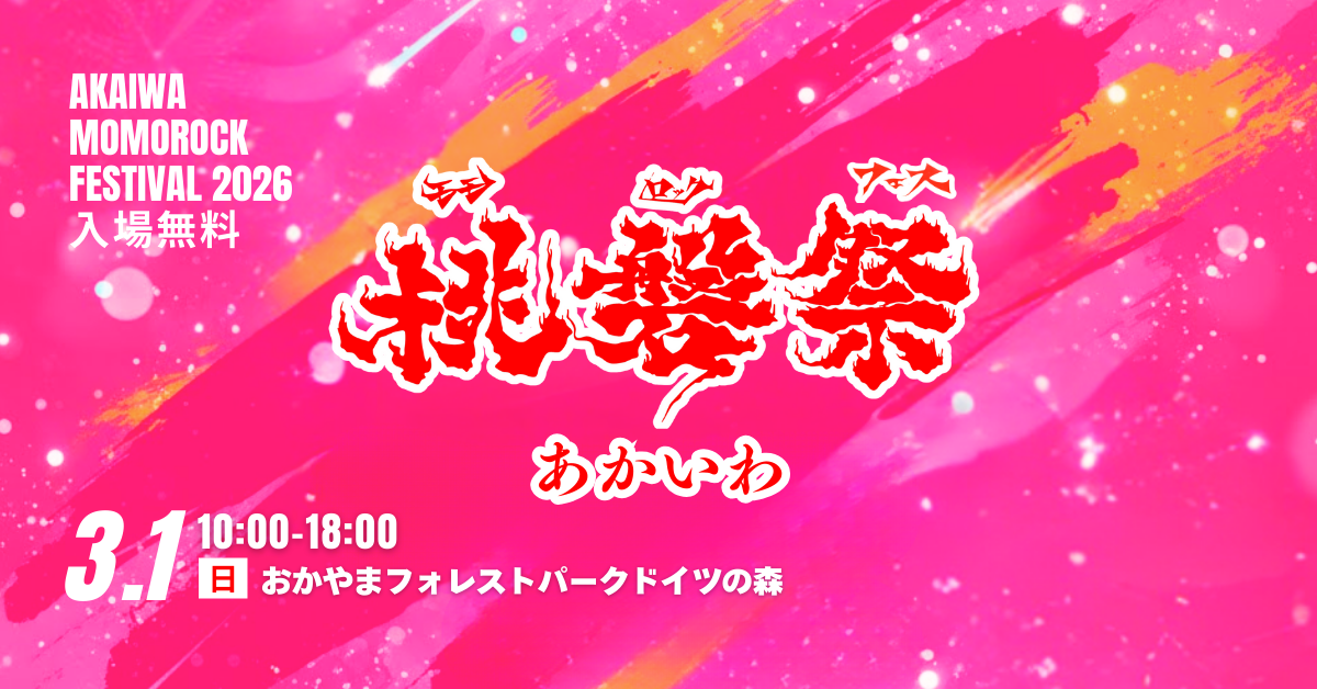 おかやまフォレストパーク ドイツの森にて「あかいわ桃磐祭」が開催されます。あかいわ桃磐祭は、赤磐市の魅力が集まる市民参加型の新しいおまつりです。様々なステージパフォーマンスのほか、食ブースや体験ブース、異文化体験、安心安全ブースなどイベントが盛りだくさんです。