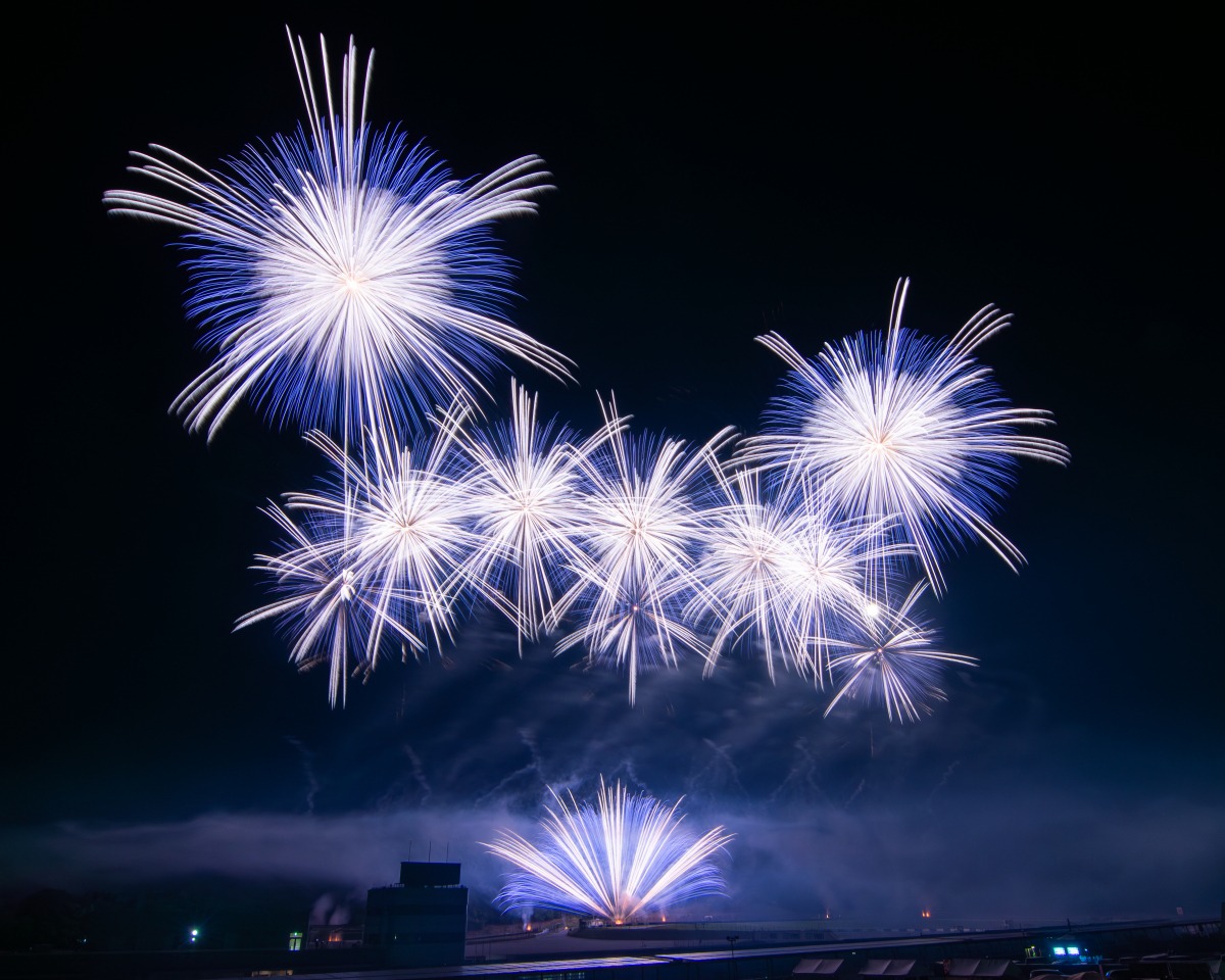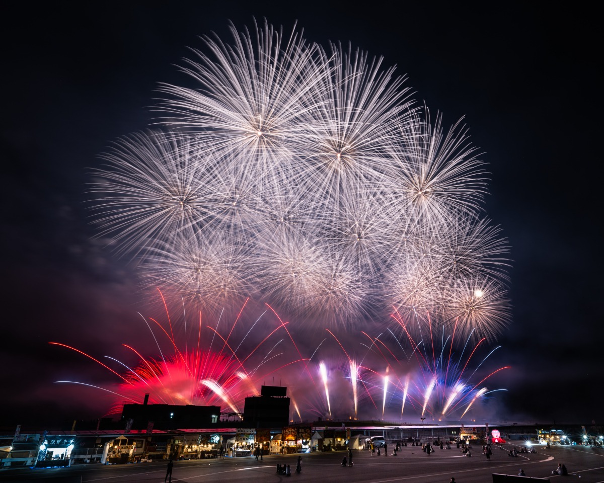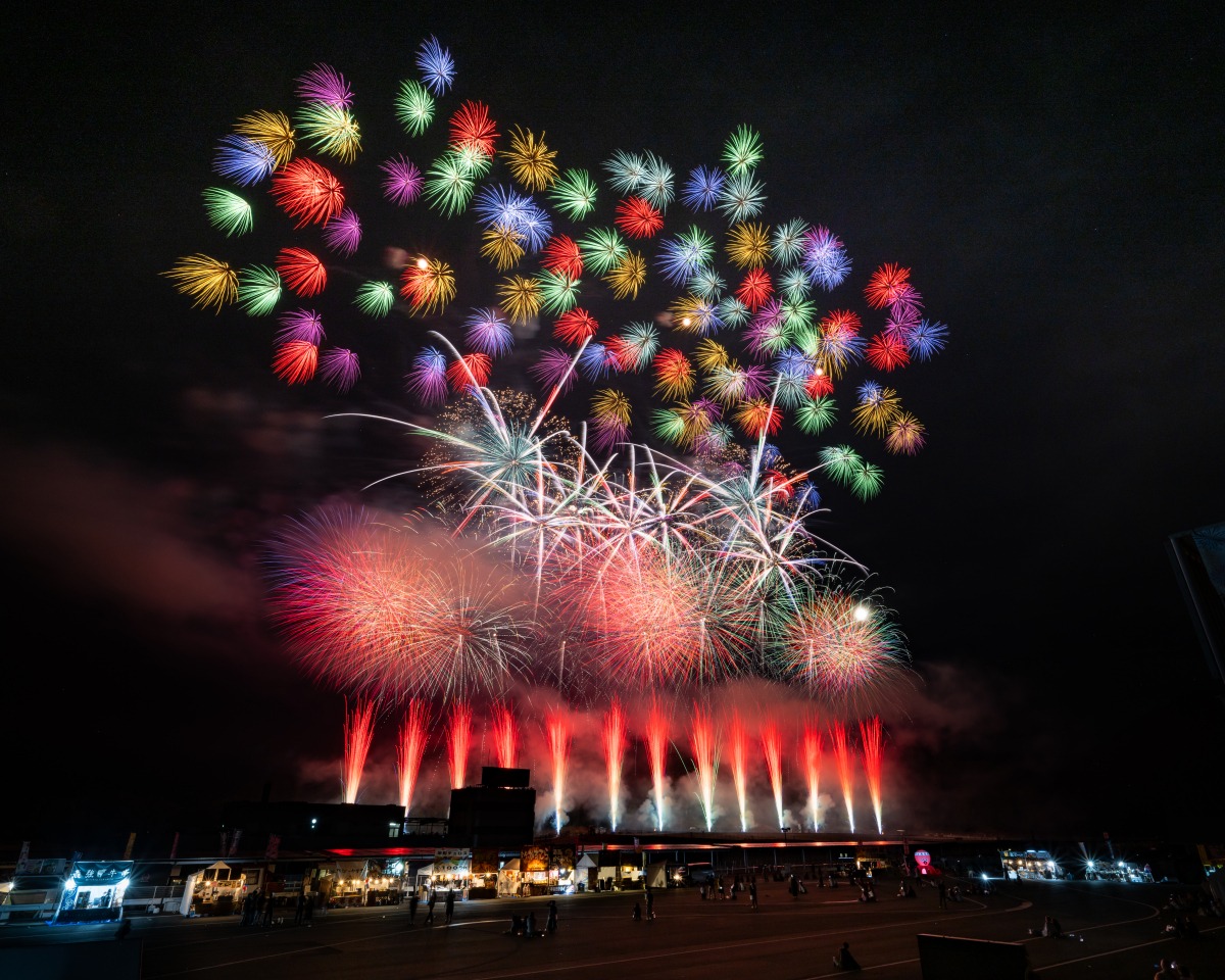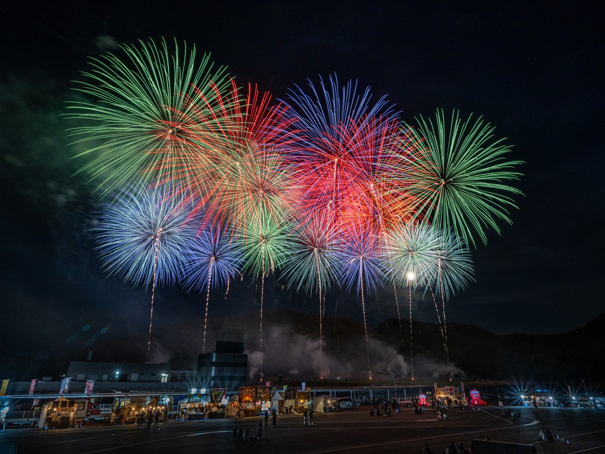 指定観覧席エリアでは、観覧客を包み込むような壮大な花火が鑑賞でき、その全景を捉えられないほど。山間部での打ち揚げとなるため、花火の音が山々に反響する音が素晴らしく、自然のサラウンドが美しい花火をより一層迫力あるものにしてくれます。
