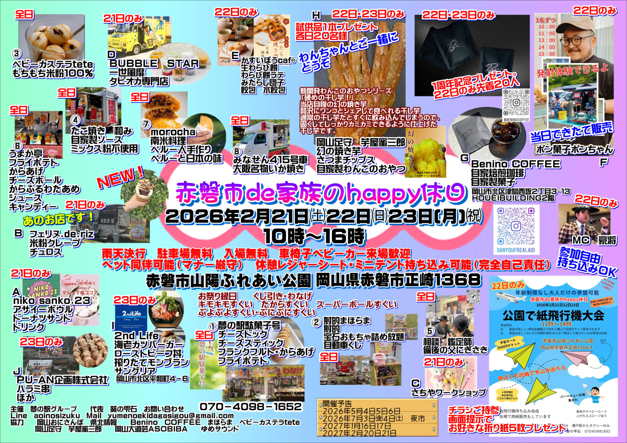 赤磐市山陽ふれあい公園にて「赤磐市de家族のhappy休日」が開催されます。美味しいグルメや縁日(10種類以上)、ワークショップなど盛りだくさん。また、紙飛行機大会(22日(日)のみ)など、関連イベントも行われます。