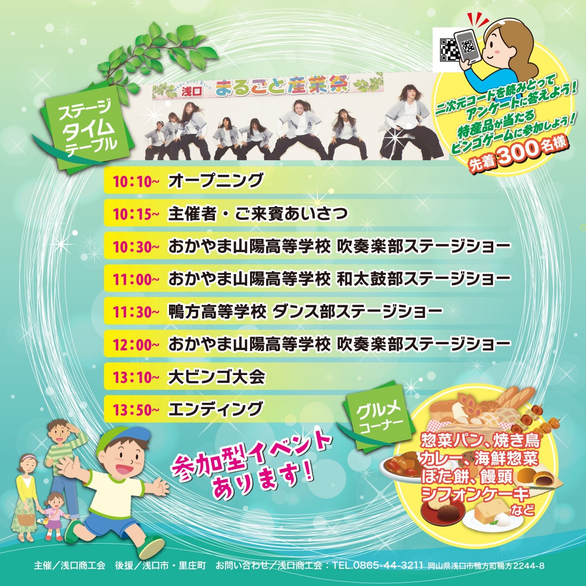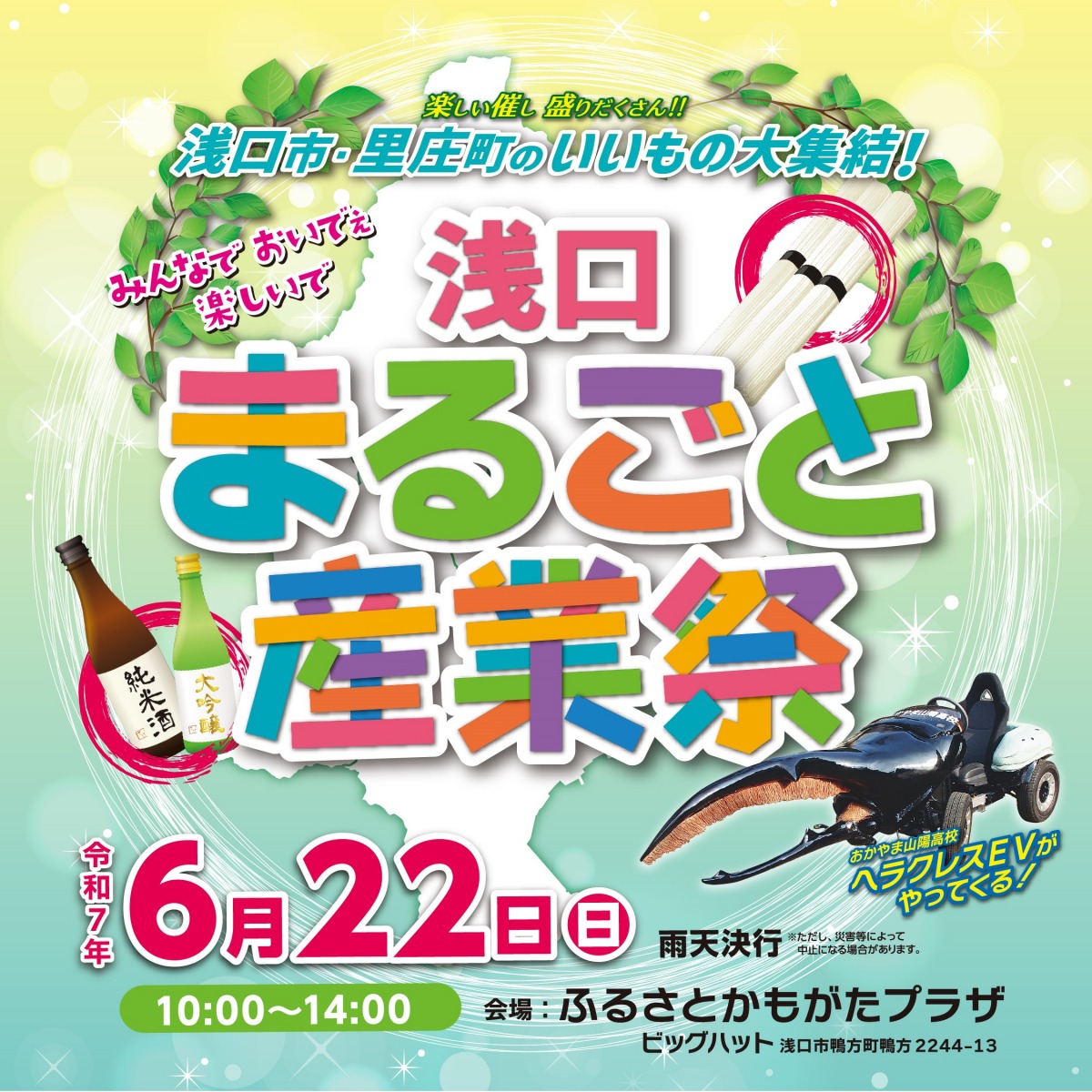 ふるさとかもがたプラザにて「浅口まるごと産業祭」が開催されます。浅口商工会会員事業所50団体以上が出展。 ステージイベントやグルメコーナーなどもあります。二次元コードを読みとってアンケートに答えると特産品が当たるビンゴゲームに参加できます。(先着300名)