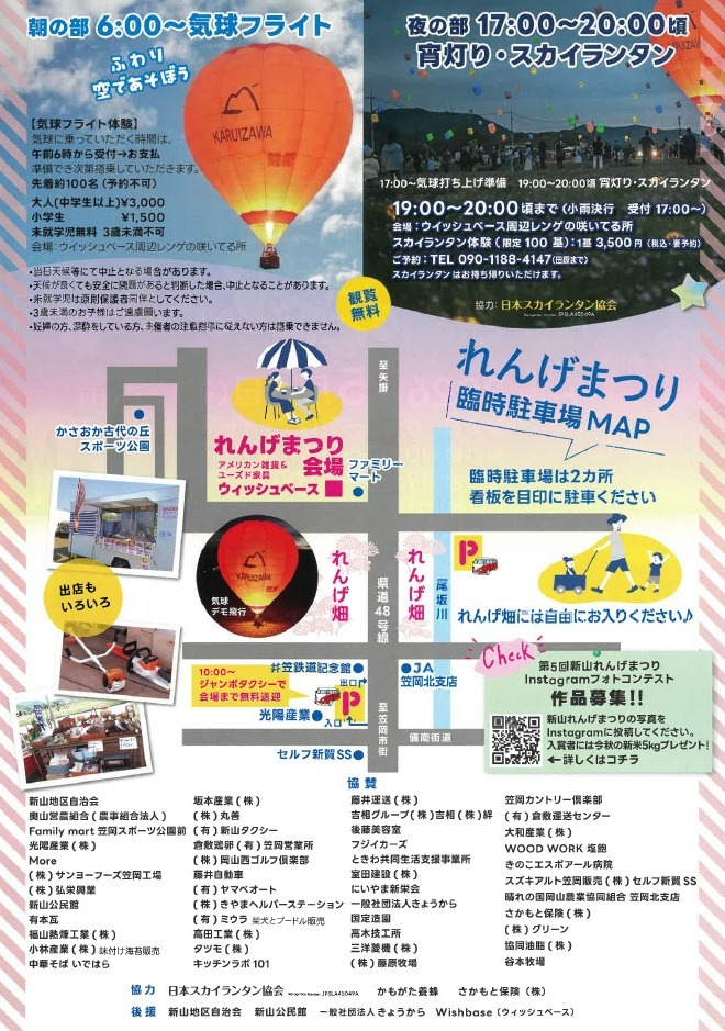 笠岡市のウィッシュベース周辺にて、「新山れんげまつり」が開催されます。岡山・笠岡市の新山(にいやま)地区に広がる、一面のピンク色のれんげ畑を会場に、気球フライト体験やグルメなどの出店、スカイランタン体験などが行われます。また、フォトコンテストも行われます。