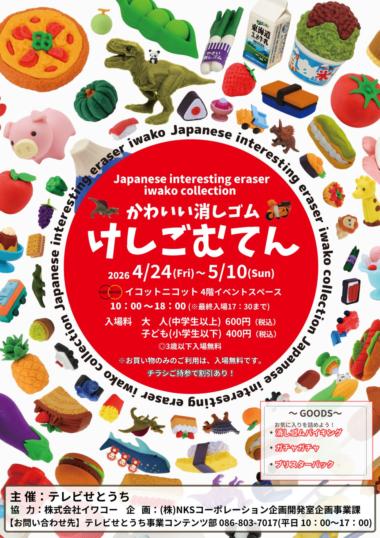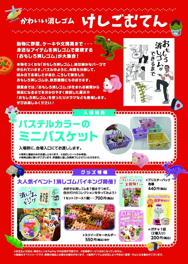 イコットニコットにて「けしごむてん」が開催されます。動物に野菜、ケーキや文房具まで、身近なアイテムを消しゴムで表現する「おもしろ消しゴム」が大集合。「おもしろ消しゴム」が生まれる瞬間から商品になるまでを分かりやすく解説した展示や「おもしろ消しゴム」を使ったジオラマなど、見て学んで楽しめる内容の展覧会です。(展示物は撮影OKです。)