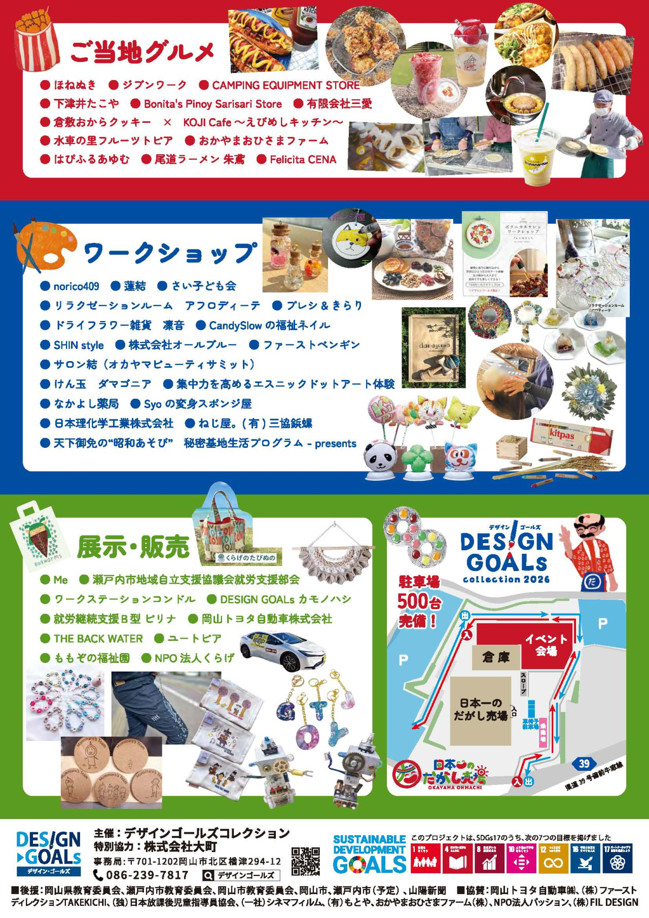 日本一のだがし売場にて「DESIGN GOALsコレクション2026」が開催されます。駄菓子、アート、SDGsをテーマに多様な人・企業が大集合。障がいの有無関係なく、食べて、遊んで、作ろう。日本理化学工業のキットパスや秘密基地PJなどワークショップ18店舗、ハンドメイド作家・福祉の展示販売が行われます。ご当地グルメなど全40店舗が大集合。障がい者アートを商品化したDESIGN GOALsの原画の展示販売もあります。